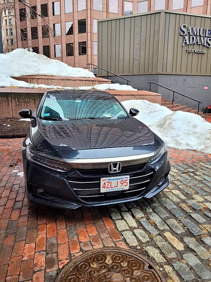 1 2 Faneuil Hall Sq, Boston, Ma, 02109Not a free legal parking spot at Faneuil Hall, fake city of boston parking permit in window, Black Honda Accord license MA 4ZlJ95 located directly at Faneuil Hall