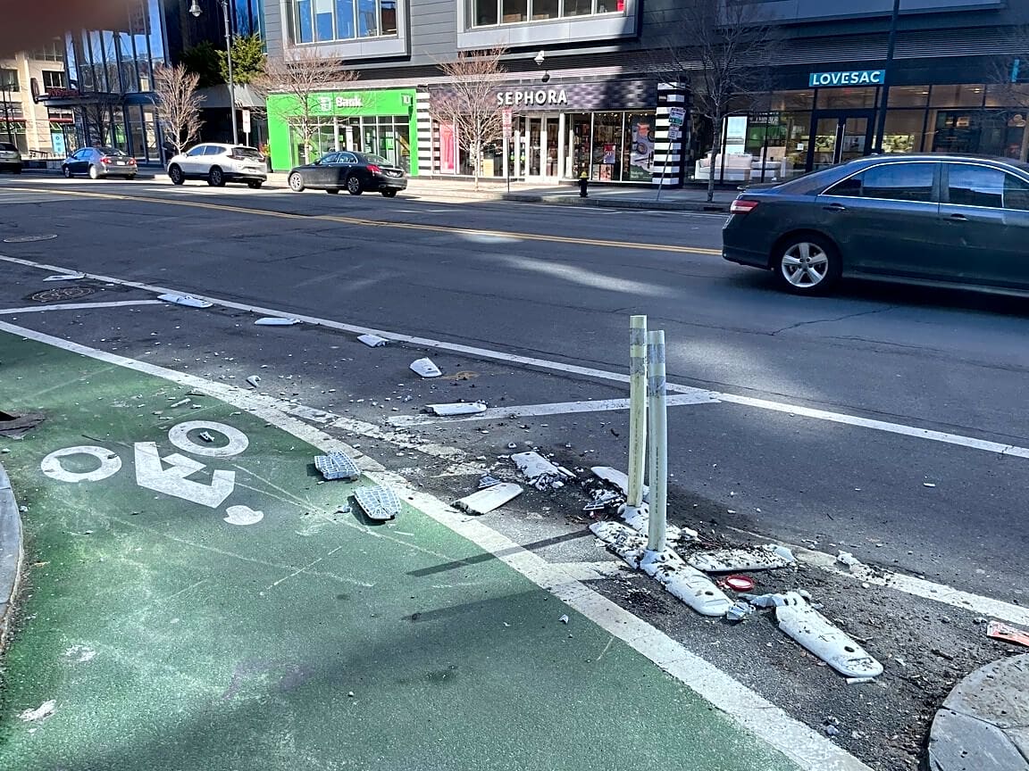 1340 Boylston St, Boston, Ma, 02215Bike lane has pieces of the flex posts broken and scattered in the street and sidewalk