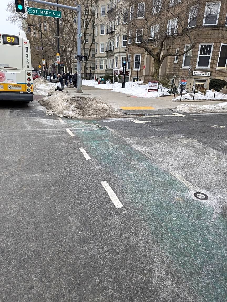 Intersection Of Saint Mary's St And Commonwealth Ave, Boston, MaSnow obstructing bike lane.
