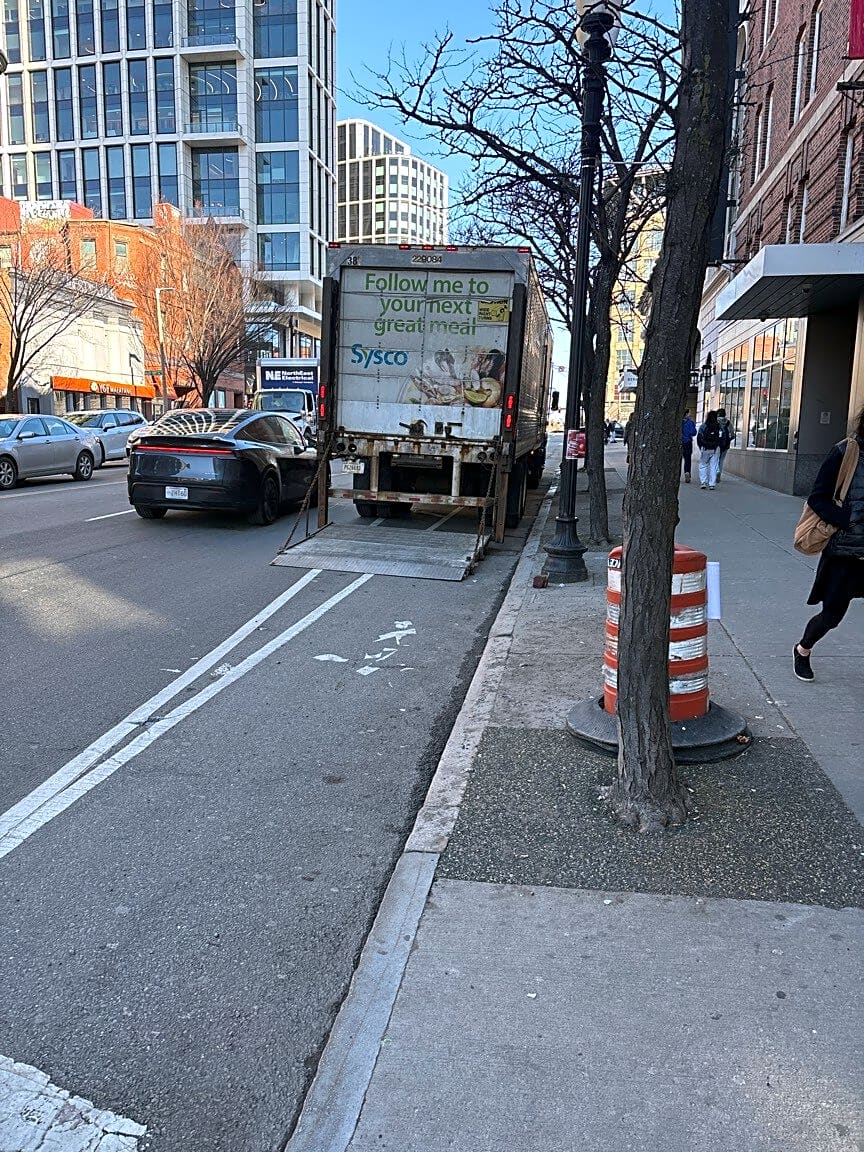 20 Kneeland St, Boston, Ma, 02111This truck was not only parked and unloading in a bike lane - he was within 15 feet of an intersection and I could not see oncoming traffic well enough to safely make a left turn ! The city needs to give a shit make our roads safe!!!