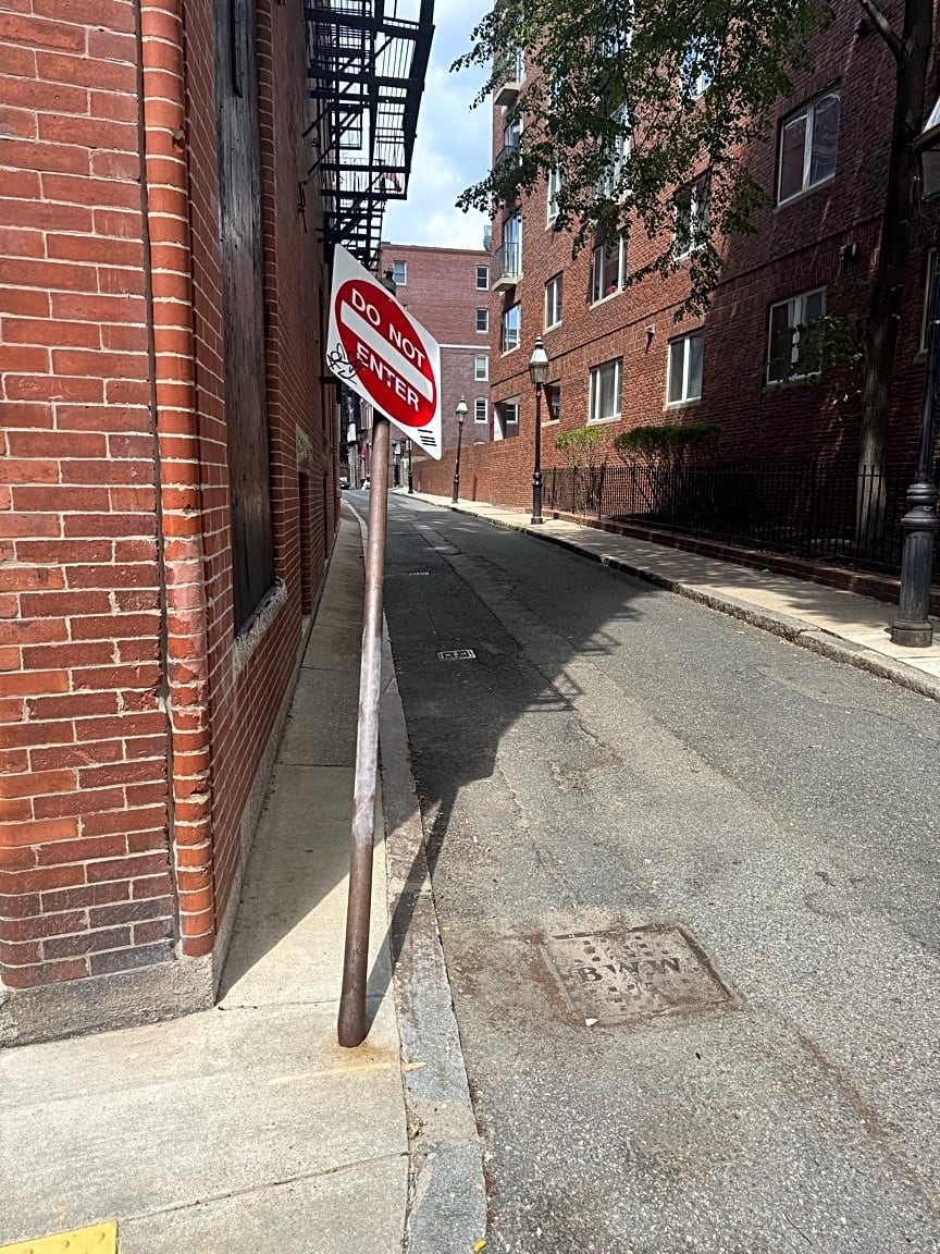 Intersection Of Harris St And North St, Boston, Mathis Do Not Enter” sign was leaning into Harris St. - Lacation: corner of Harris and North Street in the N End We moved it to align a bit with the side of building on North St as it was leaning in at a 45° angle into Harris Street, making it impossible to drive down Harris St. It was likely hit by either a delivery truck or moving truck, but it is precarious & dangerous