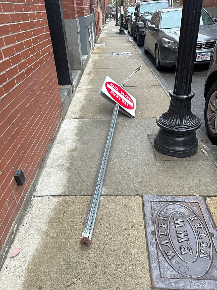 203 203 A Salem St, Boston, Ma, 02113Street sign that was reported and down from the corner of Salem and charter Street in the north end has now been pulled down and placed in the middle of the sidewalk in front of 207 Salem St.