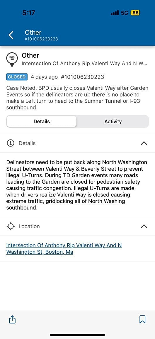 78 N Washington St, Boston, Ma, 02114Exactly what I said, BPD closes Valenti Way, Medford St, & Causeway to the Garden. Delineators prevented "illegal U-Turns" across the double yellow line, which causes severe back-ups that BPD cant stop due to the copious amounts of motor vehicles heading towards the Garden. If motorists take a right into the North End on Commercial St they can go South Bound (I-93 South & Sumner Tunnel)