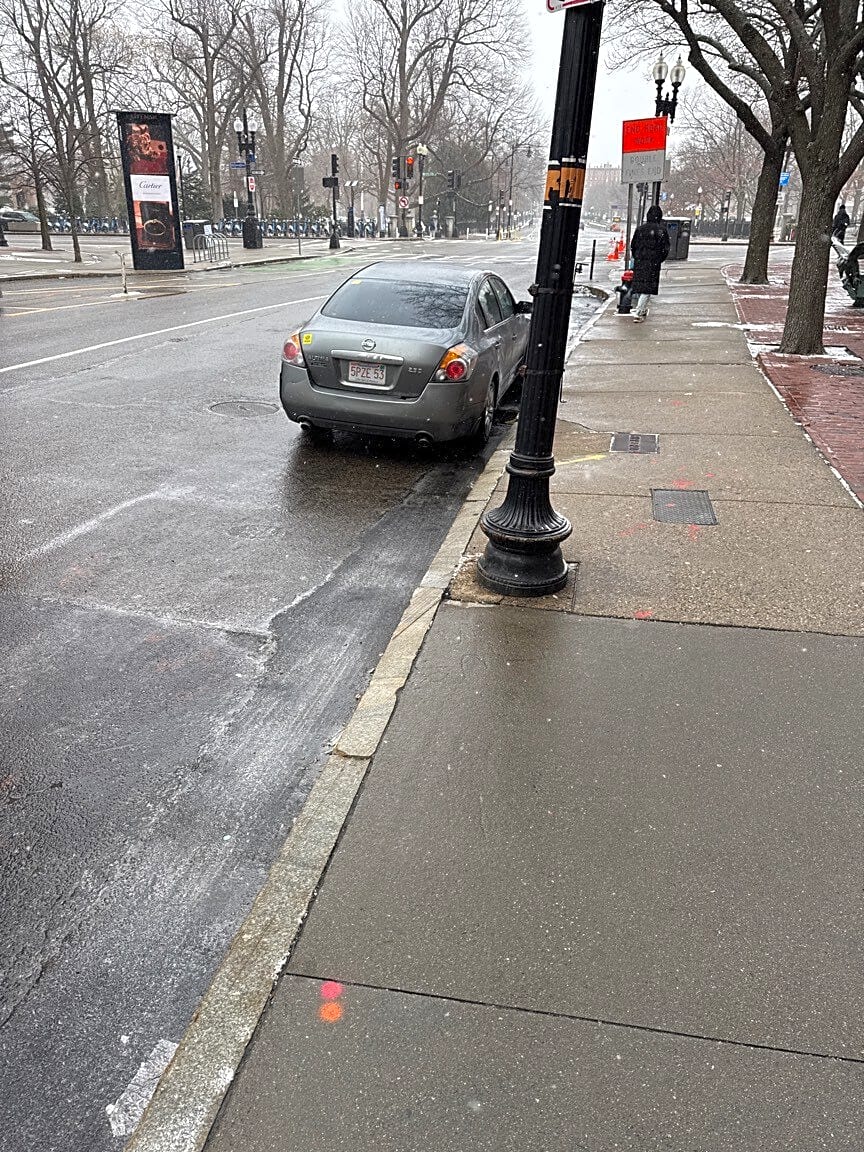 Intersection Of Charles St S And Park Plz, Boston, MaTwo illegally parked vehicles at a trolley stop