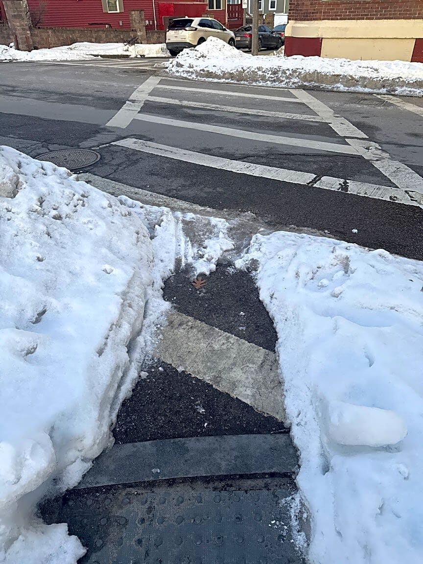 Intersection Of Mill St And Victory Rd, Dorchester, MaSnow plowed onto sidewalk, forcing pedestrians into street