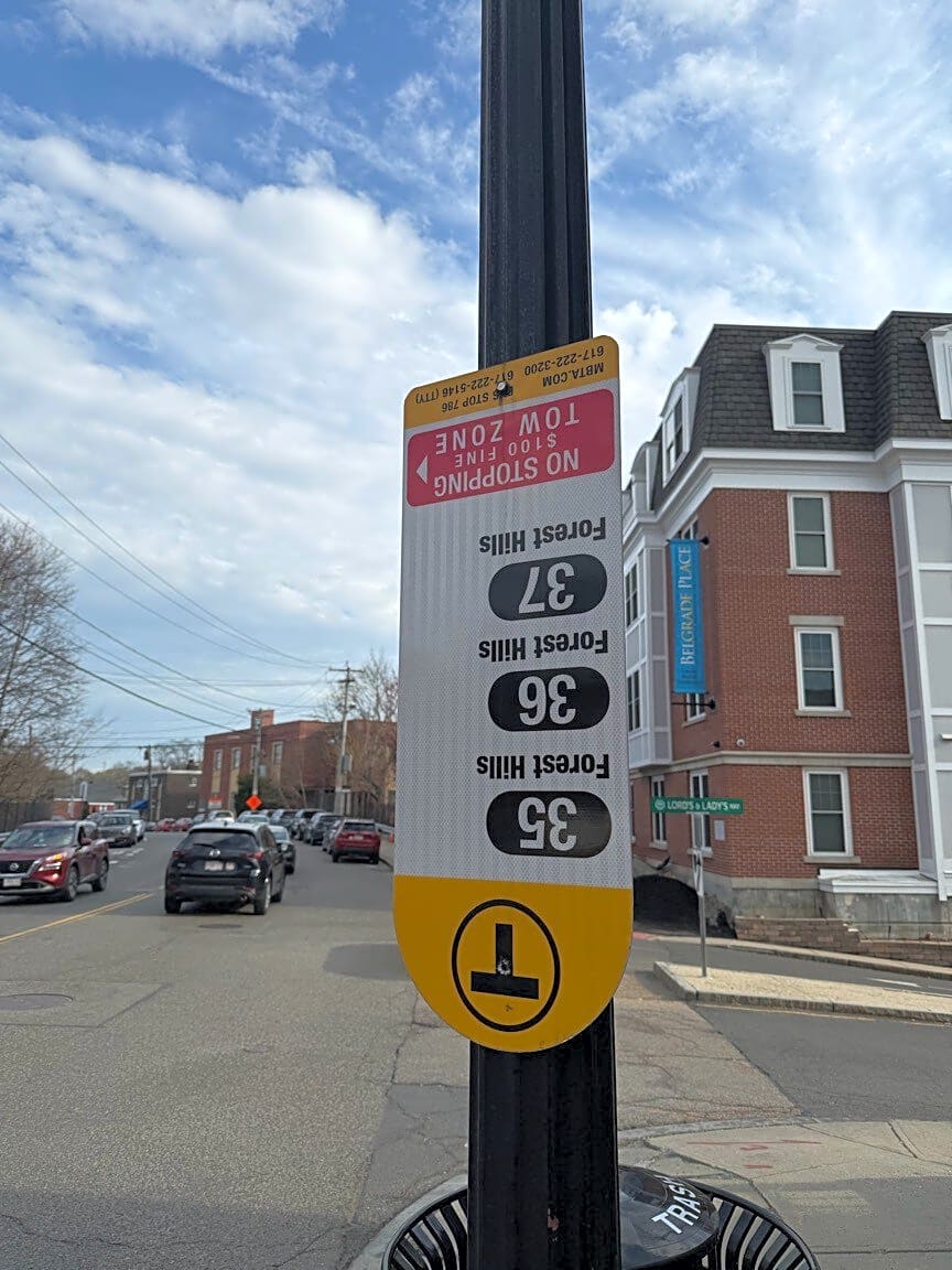 Intersection Of Centre St And Belgrade Ave And Manthorne Rd, West Roxbury, MaMBTA bus sign is hanging upside down.