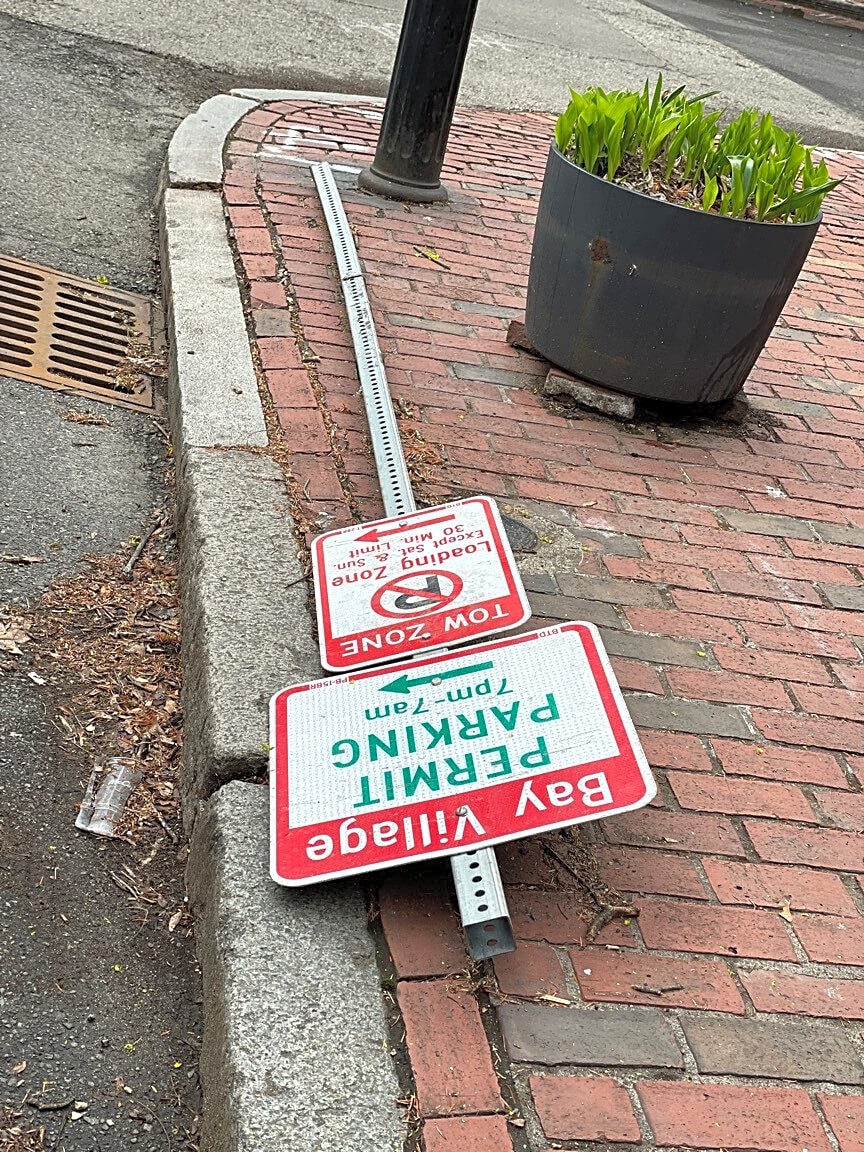 42 Lomasney Way, Boston, Ma, 02114Pedestrian crosswalk, sign, damaged, and on the ground.