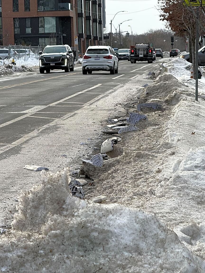 Intersection Of Everett St And Western Ave, Allston, MaConstituent reached out to our office about the broken bike land bollards on Western Ave between Everett St and Leo Birmingham Parkway on both sides have been knocked down. Noted that the shards and debris is extremely hazardous for bike riders and pedestrians (particularly in front of Notch Brewery and the Jackson Mann Community Center). Requesting that this be made safe again and the bollards be replaced (when possible)!