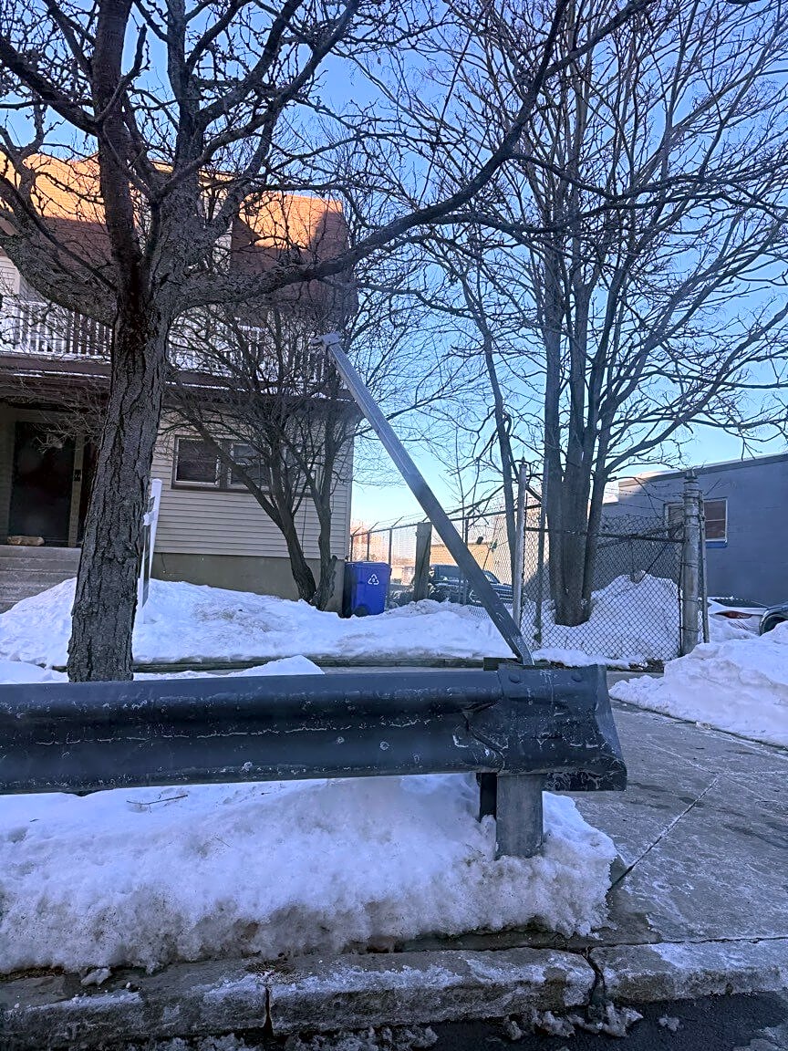 610 E Seventh St, South Boston, Ma, 02127White stop posts that were installed after a 2018 car accident on L St. in E. 6th St. were knocked down during the snowstorm on the intersection of L St. and E. 7th St. they need to be replaced. This is a very dangerous intersection. They prevent people from parking on the corner.