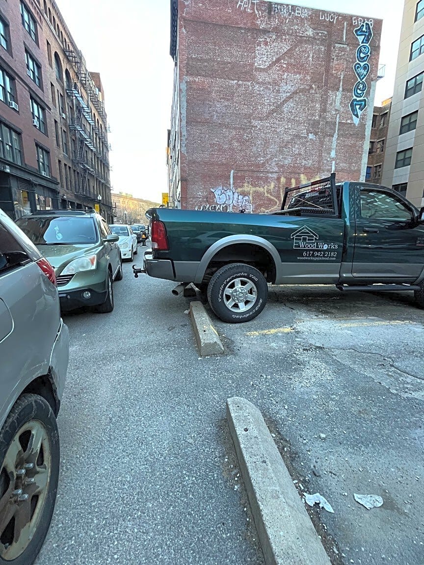 11 13 Edinboro St, Boston, Ma, 02111This obnoxious truck is blocking people from accessing the sidewalk. Yes this asphalt garbage is our sidewalk - the concrete ends and then it begins and public works won’t fix it bc they’re too busy. So please just keep cars out of the way thank you