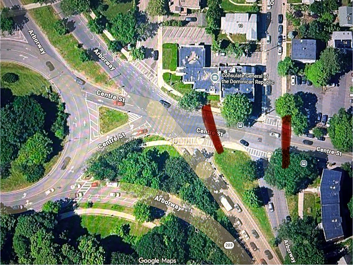 Intersection Of Orchard St And Centre St And Arborway, Jamaica Plain, MaNeed a crosswalk on Centre street, on east side of Centre Street/Arborway rotary. No way to get from South to North side of the street. Red lines drawn as examples. People constantly cross this street (myself included) at this spot and it is dangerous.