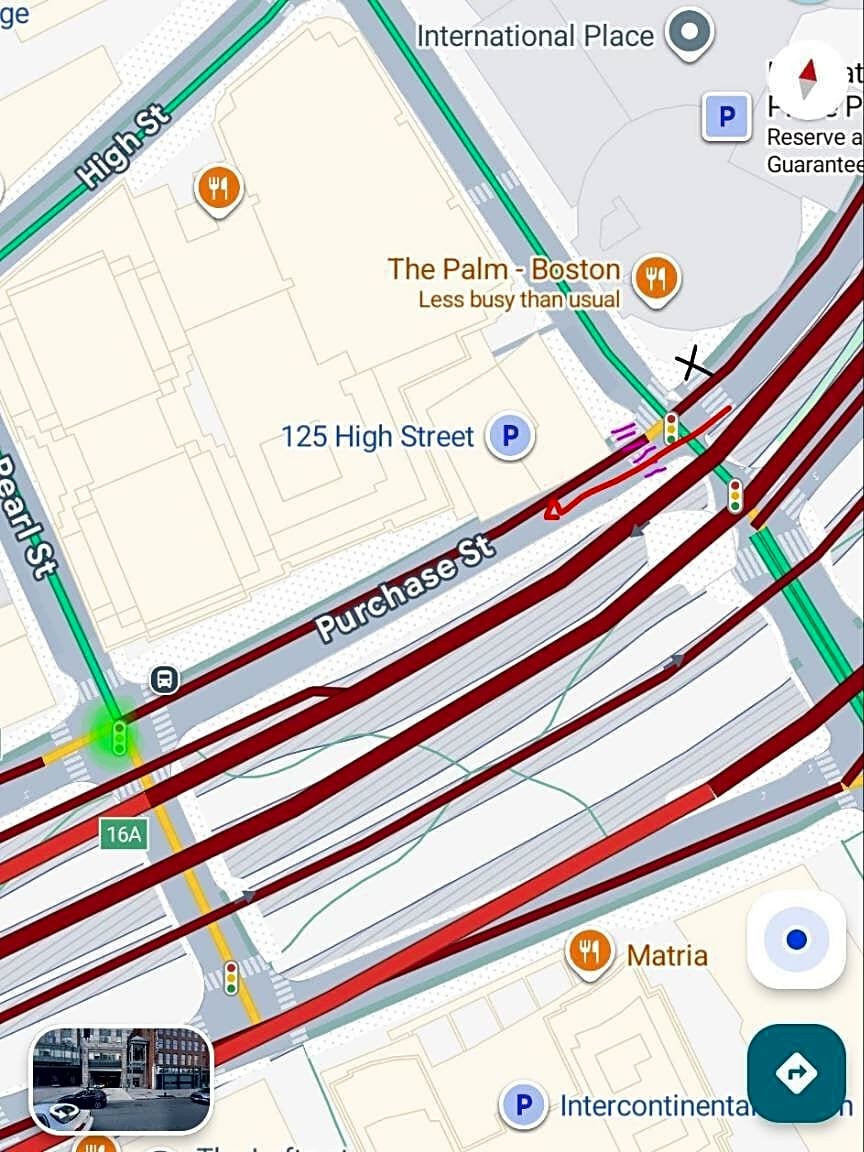 135 Oliver St, Boston, Ma, 02110I would like to report a pedestrian safety issue. I walk home from the financial district to the Seaport via Oliver Street and it is challenging to safely walk during rush hour due to the traffic patterns. At the time the pedestrian walk sign is lit to cross Purchase street (magenta lines on attached map), there's a green light for Purchase Street at Pearl Street (highlighted in green). As cars frequently run the red light on purchase street, this means that cars are continuing despite the pedestrian walk sign being lit. This issue is more dangerous on evenings when a police officer, standing at the Palm restaurant (black "X" on map) encourages vehicles to continue even when it would result in the blocking the intersection. I respectfully ask that the patterns are examined to make the area safer for pedestrians. I also ask that this issue be brought to the attention of the police, with the hopes that they are aware of the increased danger that is being caused.