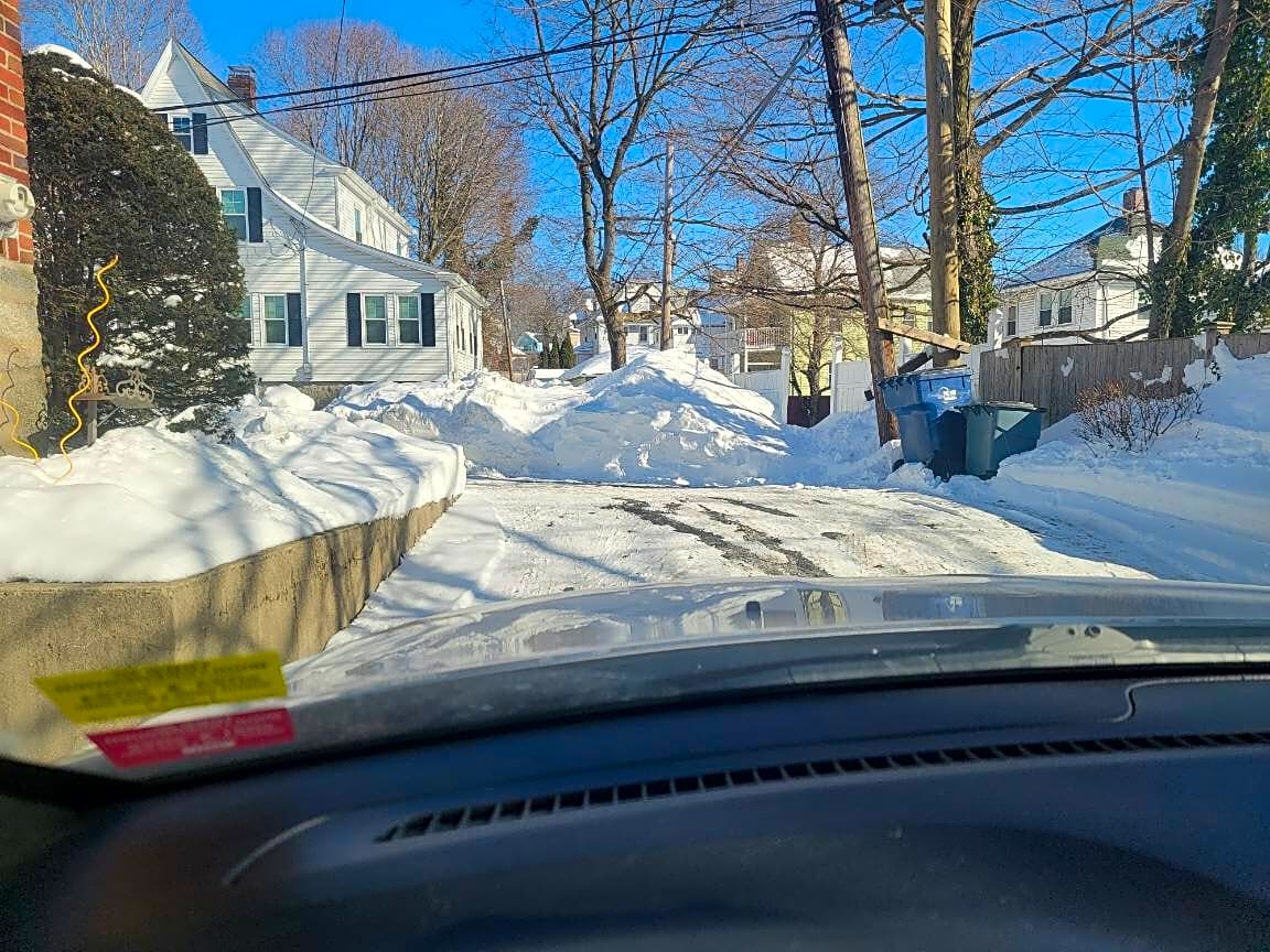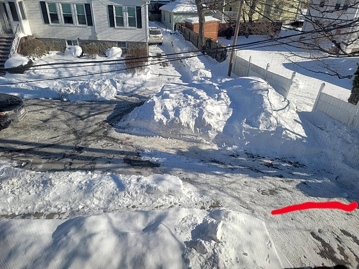 23 Gloria Rd, West Roxbury, Ma, 02132There is a pile of snow directly in front of my driveway which is in the way of me and my neighbor getting out of our driveways easily. The snow either needs to be removed or dug and dropped further back in the pile. This will probably require a backhoe or something with a front loader bucket. The red line in one of the pictures represents the width of my driveway. The other Pic represents the view from my car in my driveway.