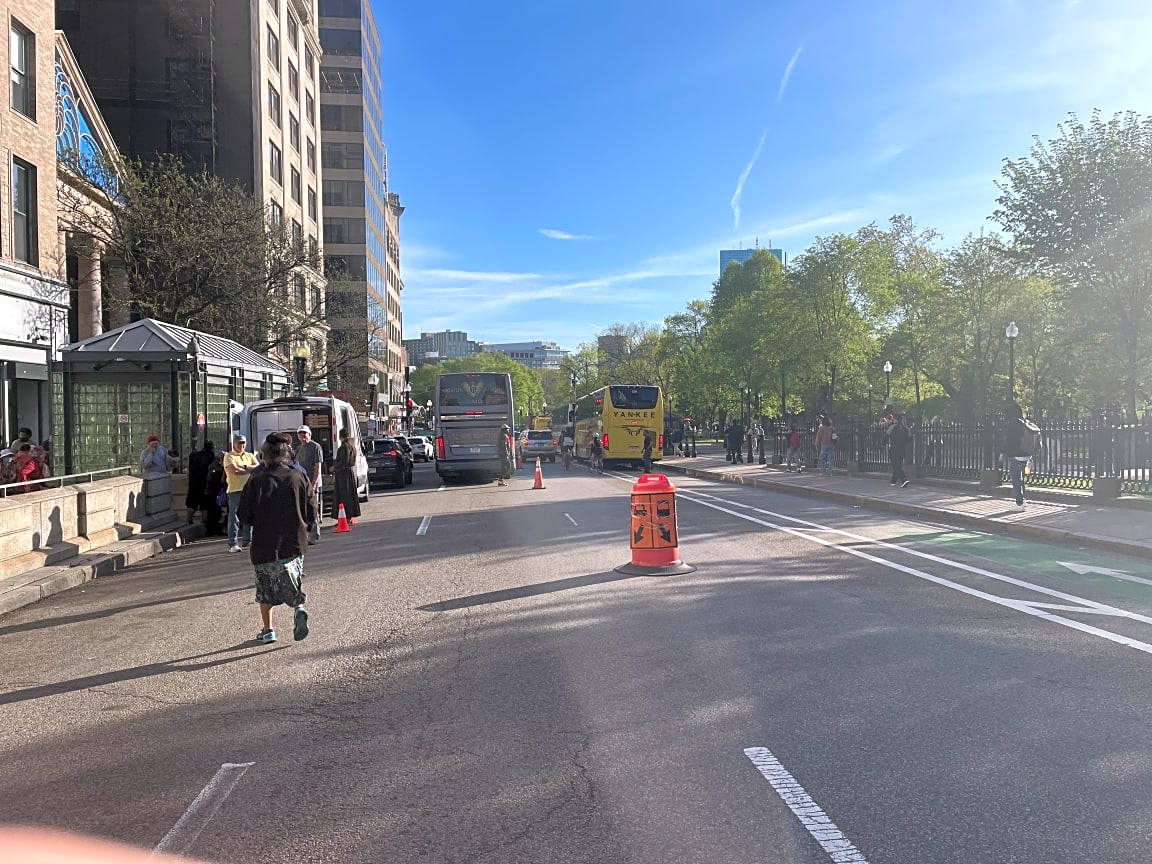 Intersection Of Winter St And Tremont St, Boston, MaHi, thanks for working to help prioritize buses during the red line shutdown. There are some signs that try to keep cars out of the bus lane on Tremont Street. The sign is really hard to read quickly by drivers, and the barrel is often turned to the side. Would it be possible to improve on this? The shutdown is for a long enough time that anything you can do to help keep cars out of the bus lane would be so helpful when we are on the diversion buses headed south. A version of MUTCD R3-11 would be useful with an arrow on it. Next to it, a sign that says "cars keep left", a modified R4-8a. | Case (SR) Type: [MBTA] Referred To: [MBTA]