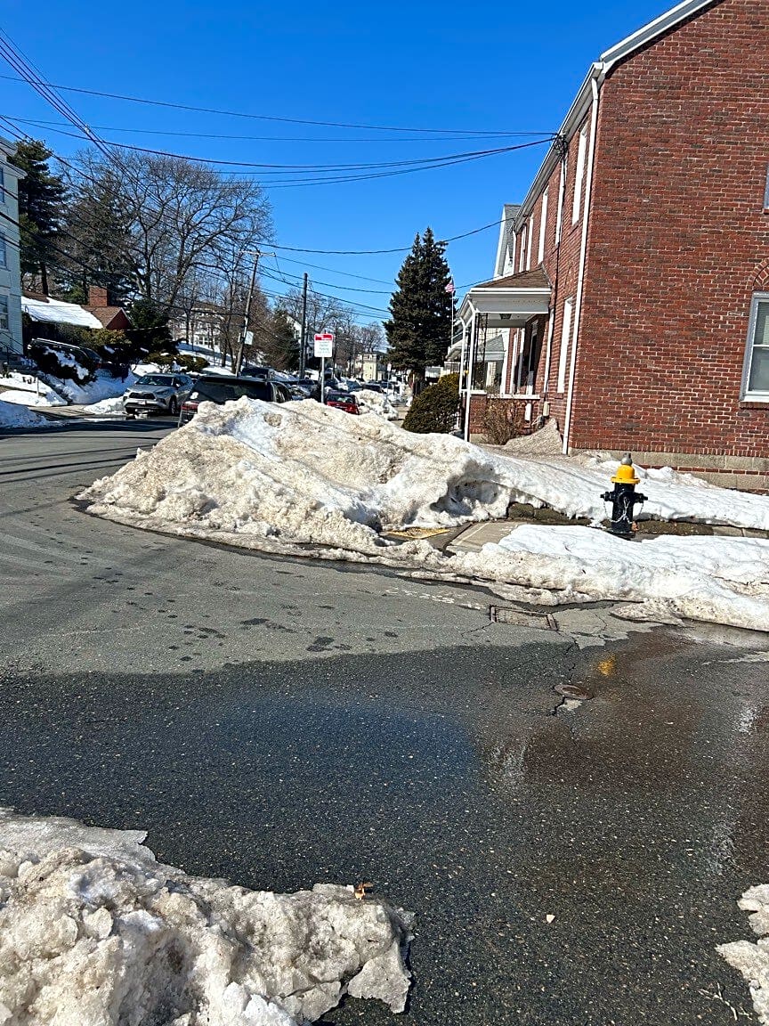 Intersection Of Shannon St And Union St, Brighton, MaMound of snow completely blocking intersection, sidewalk also not shoveled