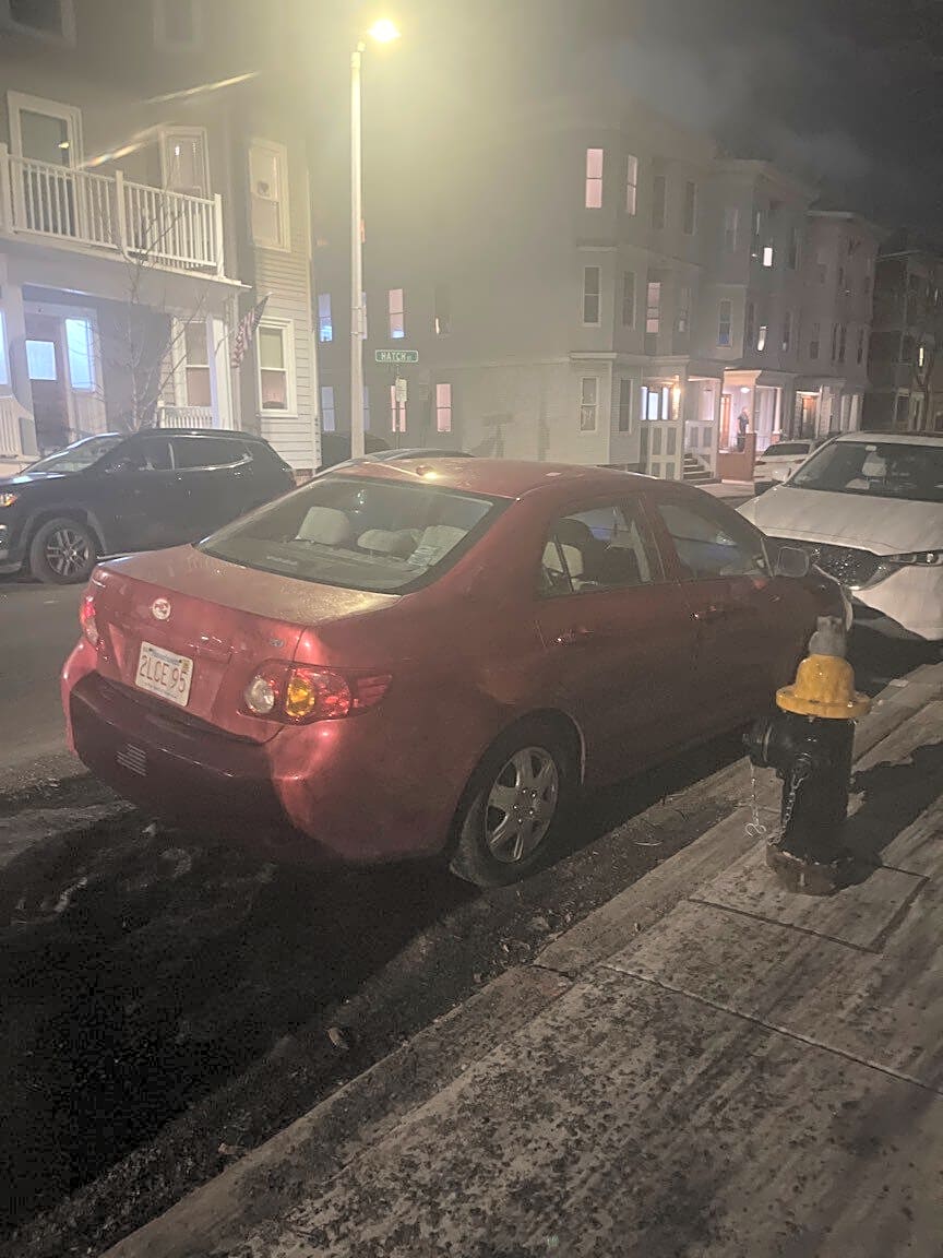 71 Marine Rd, South Boston, Ma, 02127Car parked directly on hydrant . 2LCE95 red car- come ticket and tow