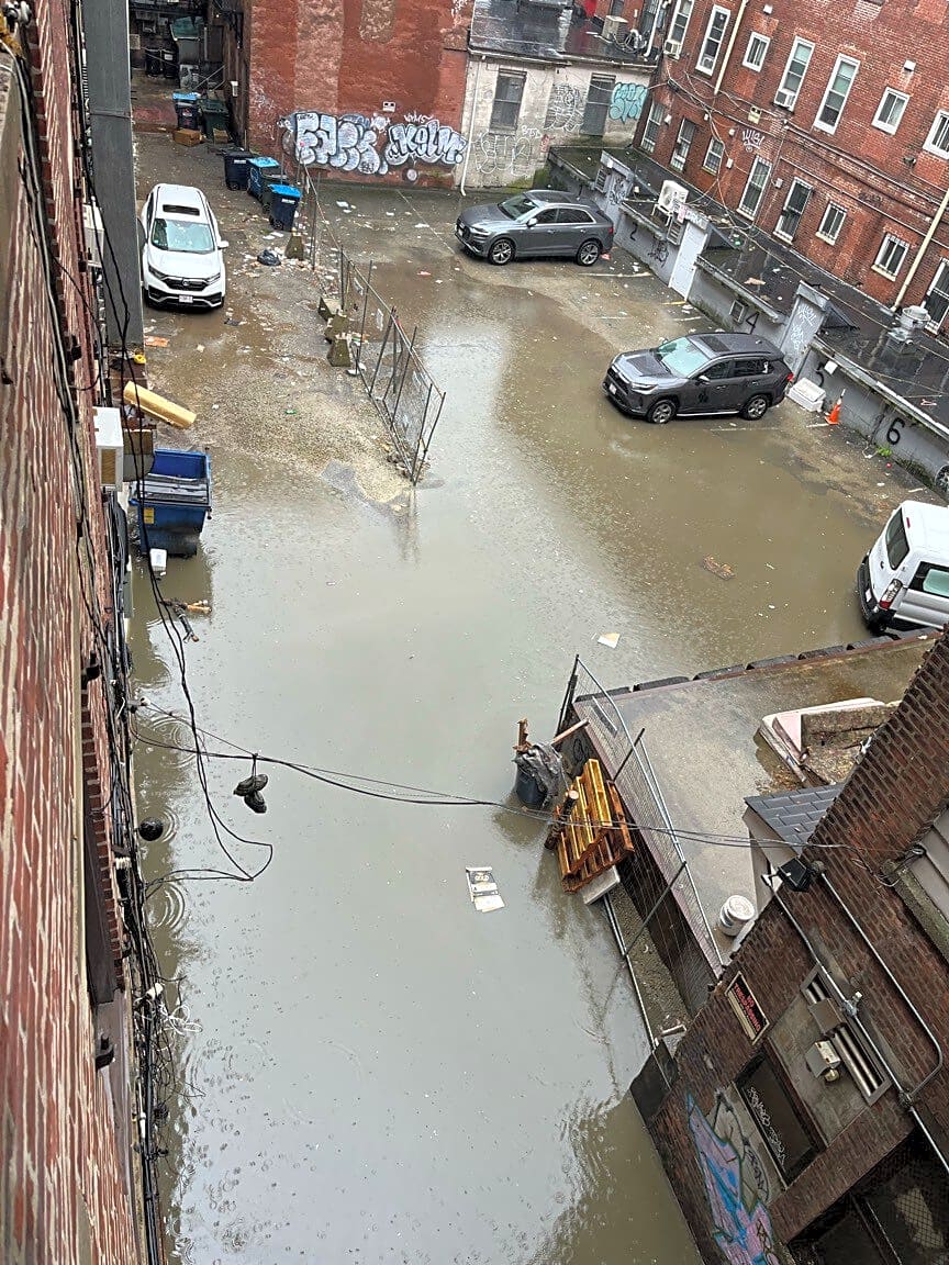 17 19 Edinboro St, Boston, Ma, 02111The water from the road behind our building is FLOODING our building - the water is coming into the first floor back door and rushing into the basement! This seems like a disaster waiting to happen - this building is very old and I don’t know if it can handle all of this rushing water flooding it. What is the City doing to keep rain water from flooding the buildings?! It’s literally a lake in the road and coming into all the basements on Edinboro! Are we at risk for being trapped inside? We need assistance !!!