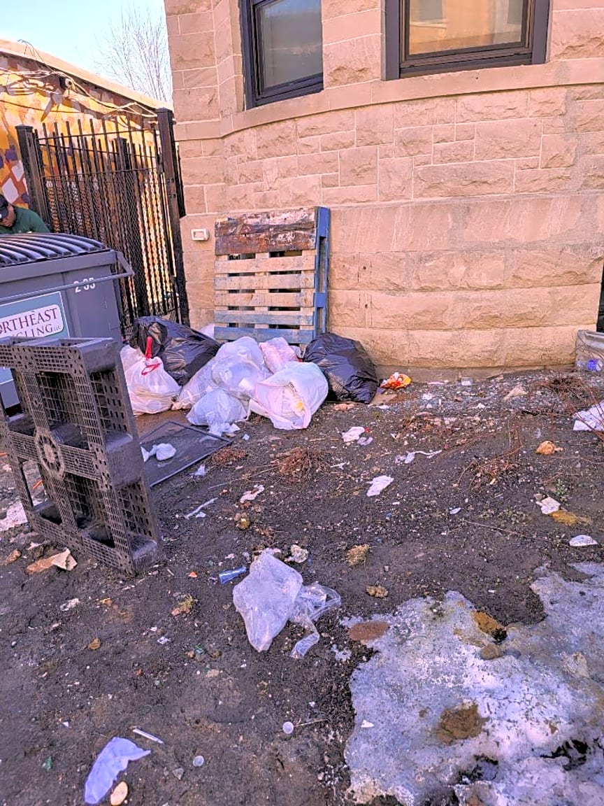 CLOSED #101006557270Noted. Heavy amount of trash and debris on grounds at dumpster area for Jhade .Market and Cabo Verde. Store owner states trash is from illegal dumping. Large amount of trash on grounds of apartment building next to the market. An abatement will be served to the property owner that has the market and restaurant as Tennants. An abatement will also be served to the owner of the apartment complex at 91-101 Waldeck St. I will refer the market and restaurant to the Health Division and I will alert the Code Enforcement Division to the ongoing trash issues.