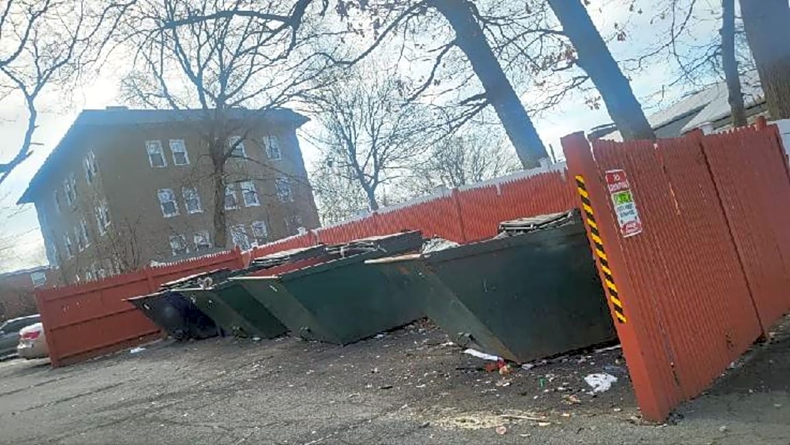 824 Blue Hill Ave, 1 R, Dorchester, Ma, 02124What is the nature of the problem: [Dumpster in rear, regularly overflows. When placed out for collection, trash and debris fly around the street]