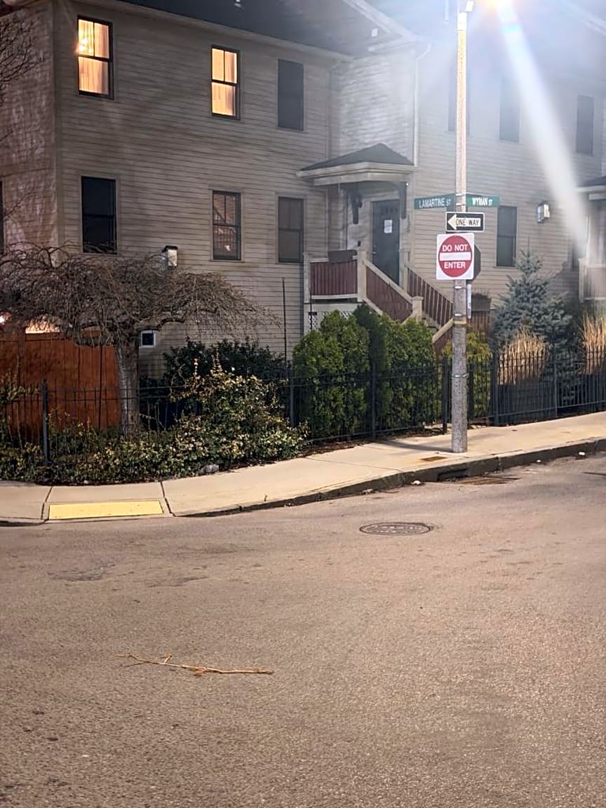 Intersection Of Wyman St And Lamartine St, Jamaica Plain, MaNeedles on side walk