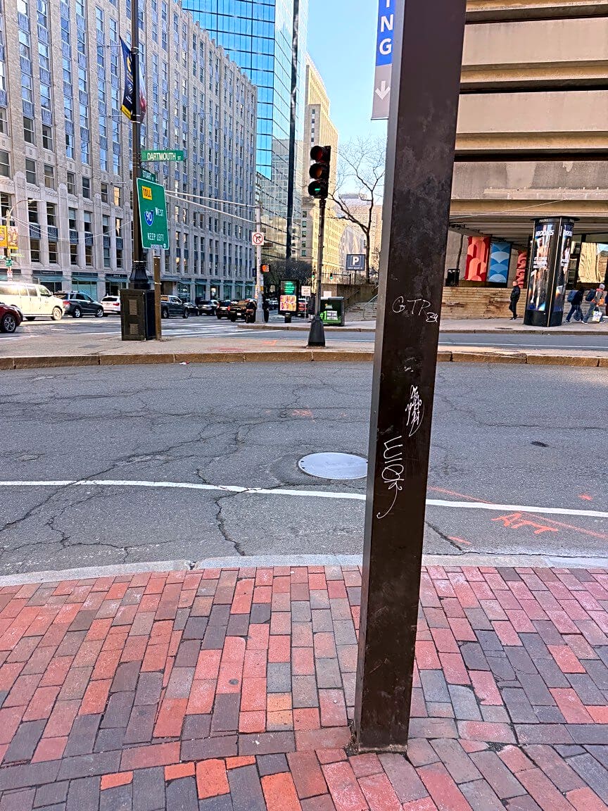 Intersection Of Dartmouth St And Stuart St, Boston, MaGraffiti base of street light outside mall entrance