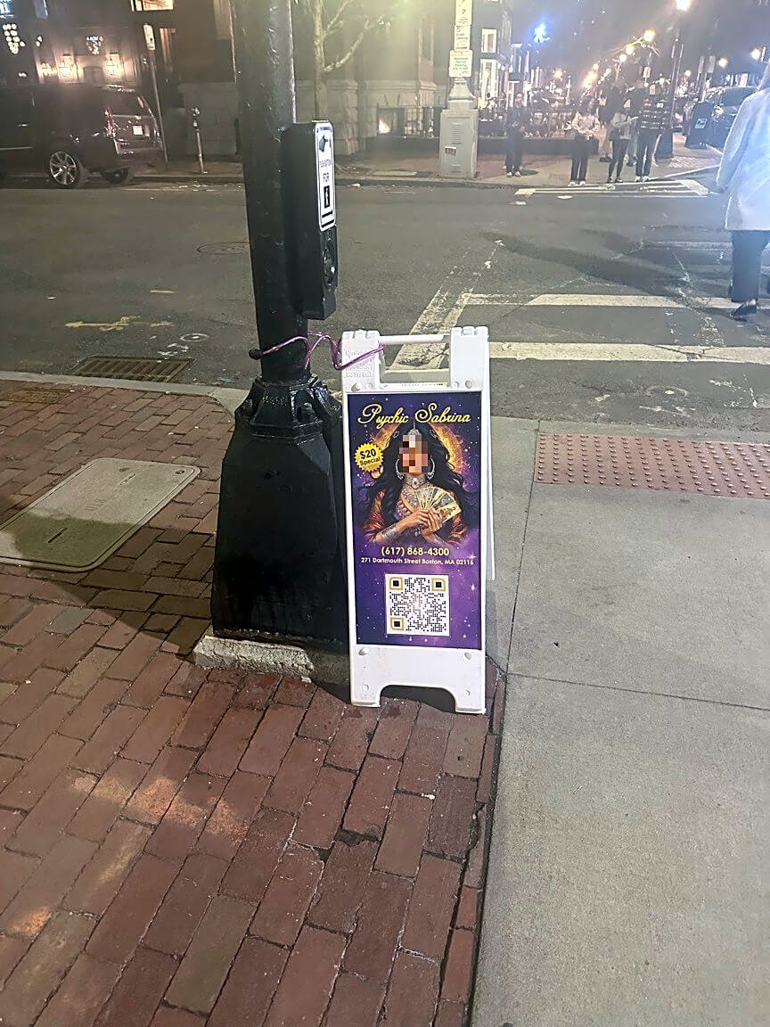 Intersection Of Dartmouth St And Newbury St, Boston, MaPsychic sandwich board sign attached to street lights. Two signs, corner of Newbury and Dartmouth near Lush and near Alo