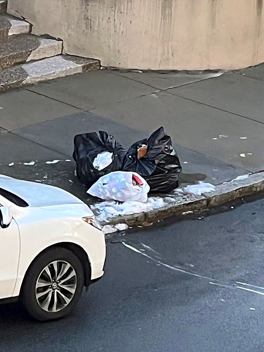 28 Coffey St, Dorchester, Ma, 02122Trash littering front of house, near driveway, from a broken trash bag.