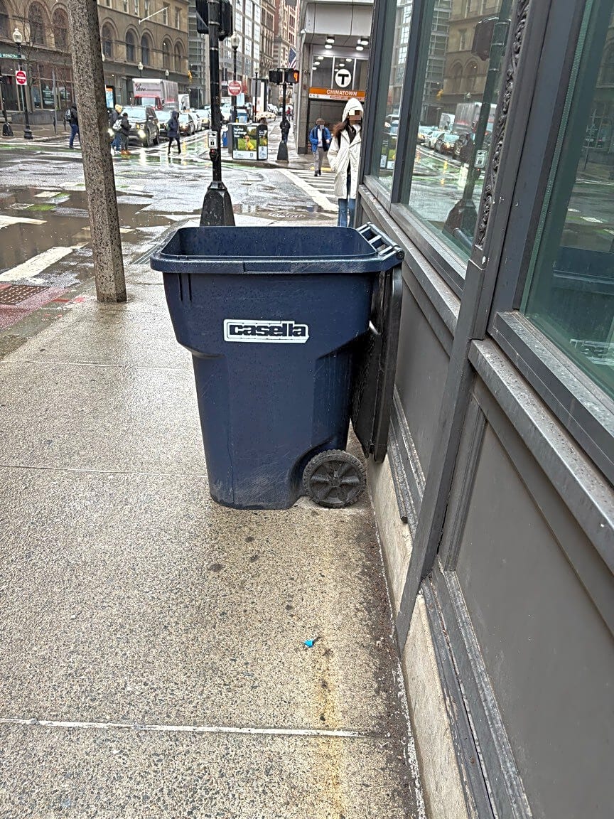 26 Essex St, Boston, Ma, 02111Hi, there is an unauthorized trash container on the Essex St sidewalk. I am the property manager for 600 Washington St. Our building encompasses the full block between Washington Street and Harrison Avenue. This trash container does not belong to us. Please remove it. I do not want to get a ticket for a trash bin that doesn’t belong here.