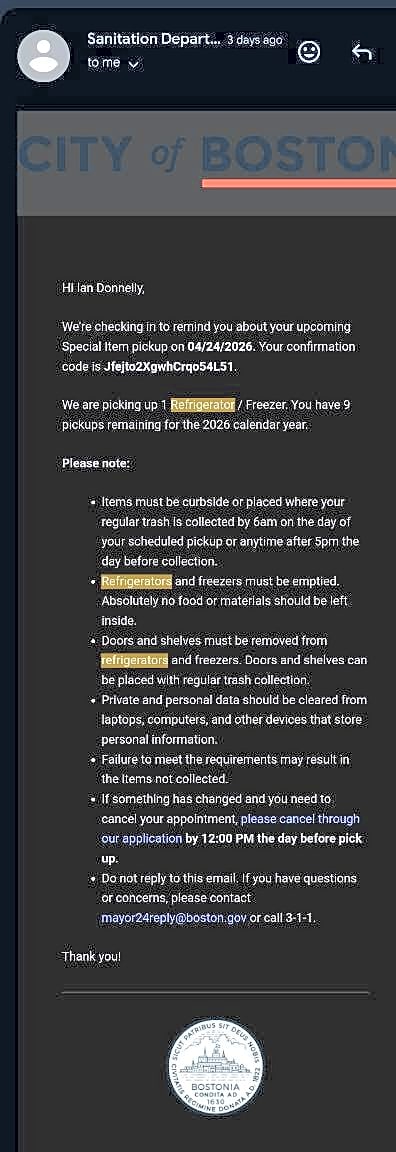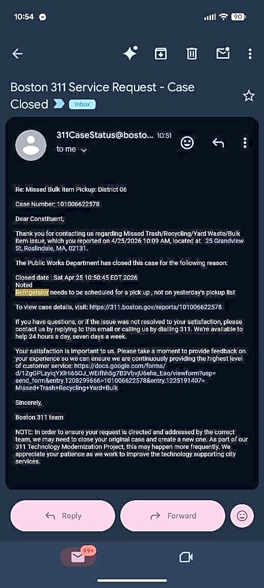 25 Grandview St, Roslindale, Ma, 02131I scheduled a bulk item (refrigerator) pickup (confirmation email attached). The fridge was not picked up (photo of fridge on curb). I called 311 to have it picked up. The case was closed saying it needs to be scheduled and was not on the pickup list (case closure email attached). Can you please come get my fridge.