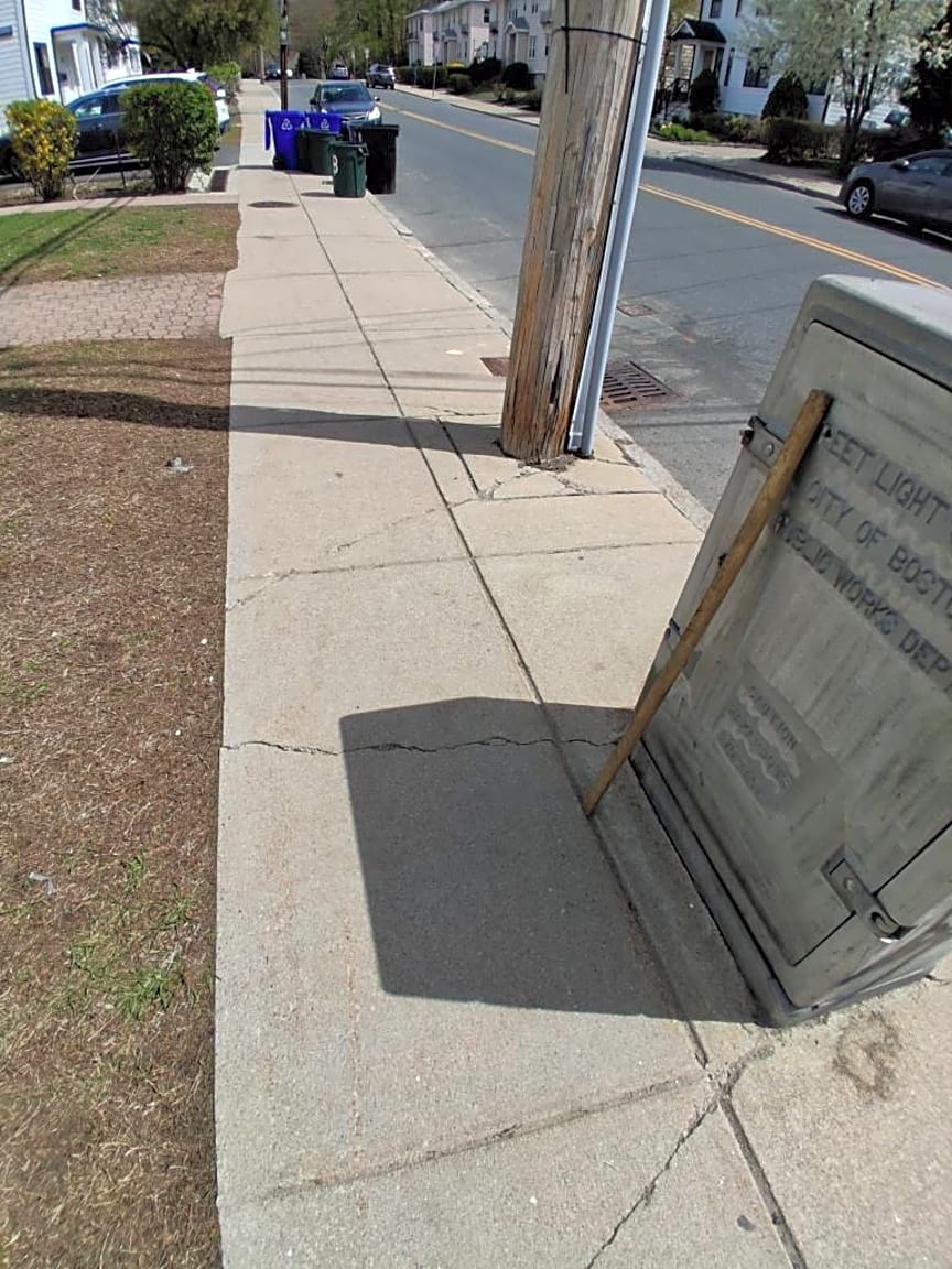 218 Foster St, Brighton, Ma, 02135Broken glass on the sidewalk outside of 218 Foster Street in Brighton.