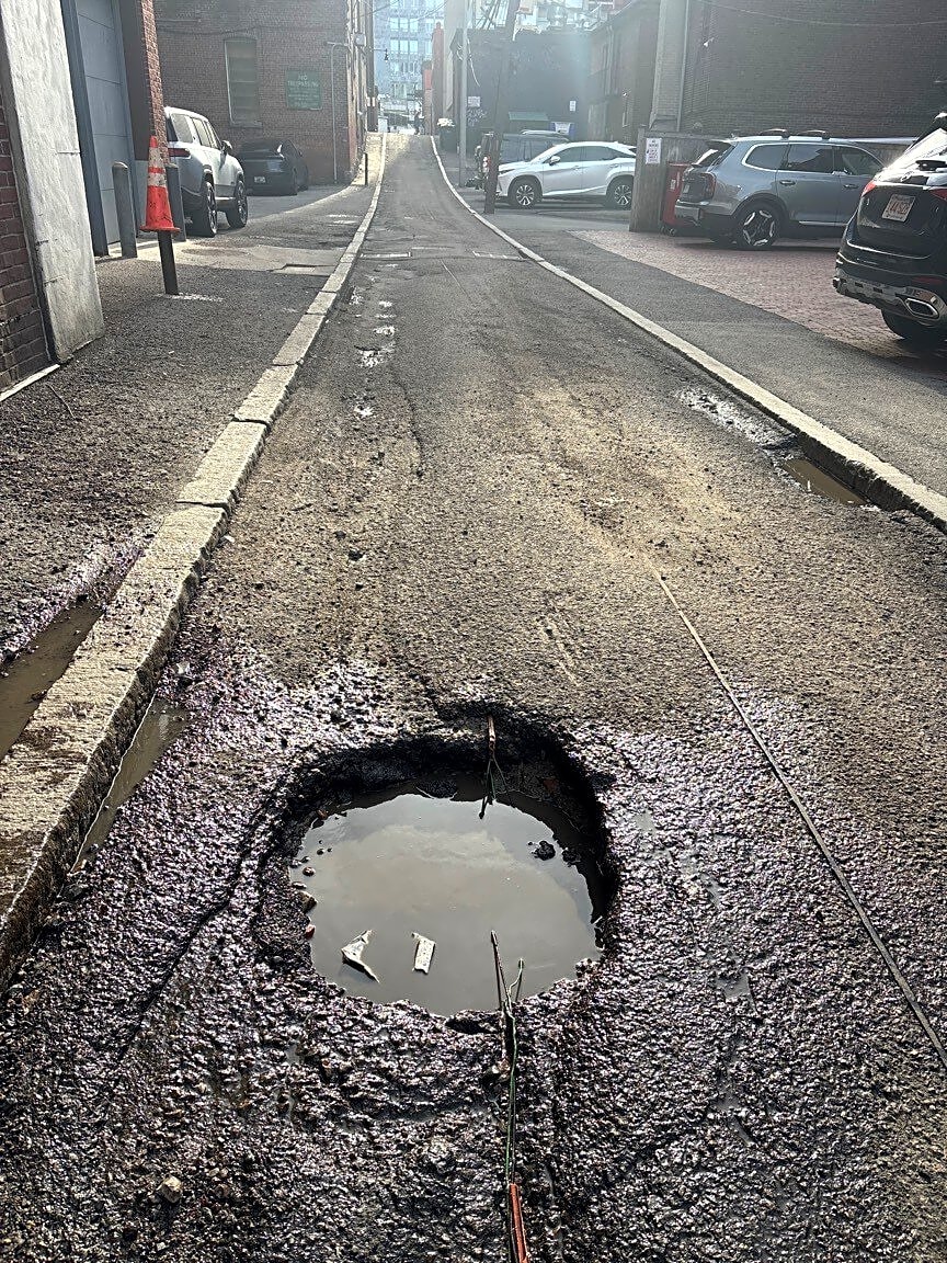 Intersection Of Chestnut Ave And Hoffman St, Jamaica Plain, MaPothole at the address listed and then two more large potholes on hoffman | Where exactly on the pavement is the pothole: [On Roadway] What is the approximate size of the pothole: [foot] Date when pothole noticed: [03/27/2026] Time when pothole noticed: [16:40]