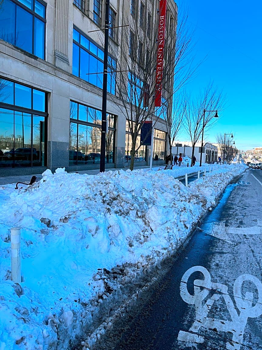 Intersection Of Essex St And Commonwealth Ave, Boston, MaComm Ave bike lanes are not plowed, and the very minimal sections that are lead to snowbanks. It’s been 2 weeks since the storm.