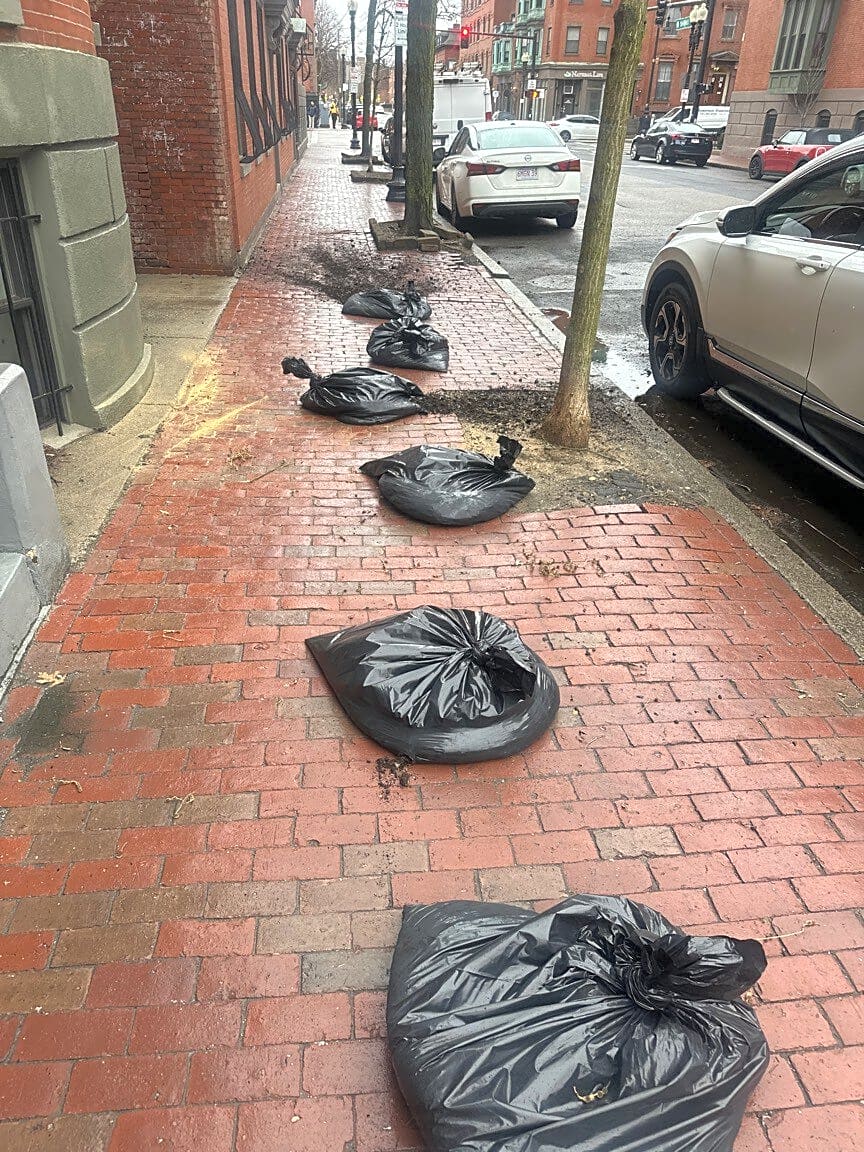 Trash bags all over sidewalk. Strollers wheelchairs can’t pass