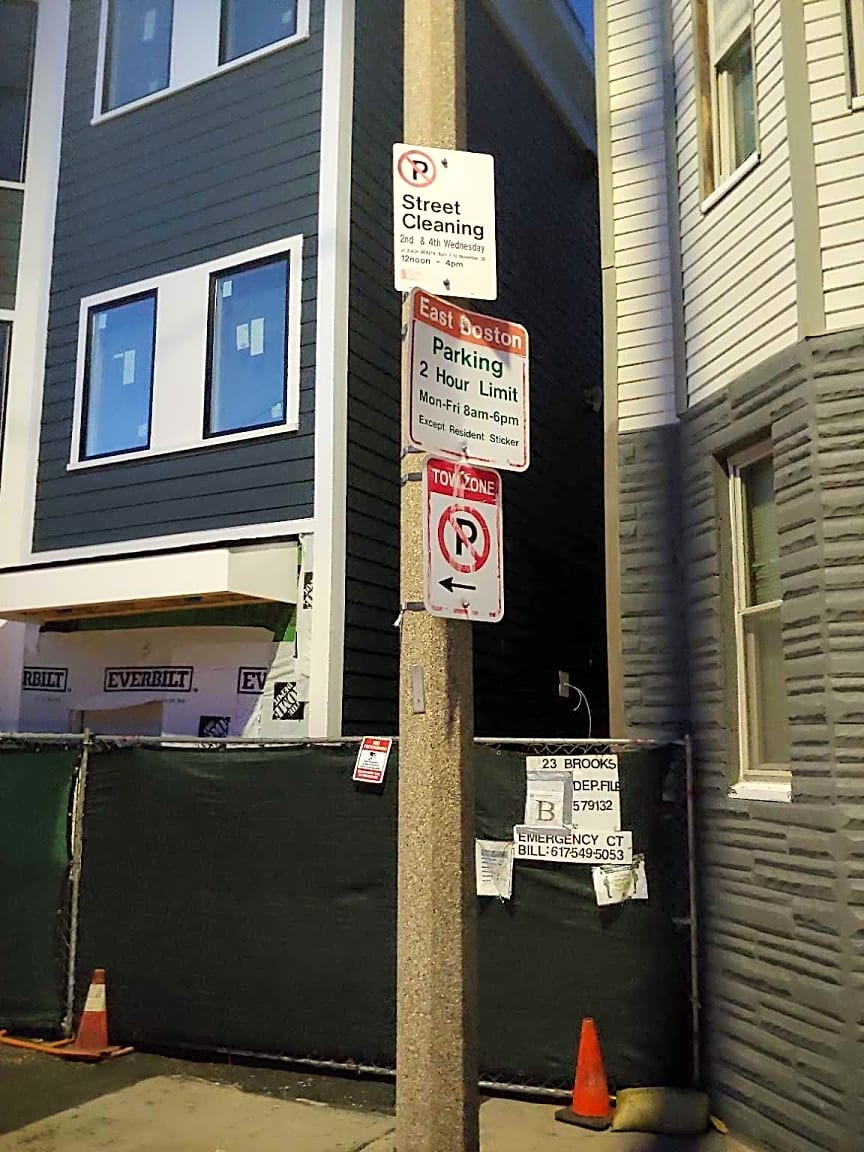 Intersection Of Brooks St And Chelsea St, East Boston, MaTo the side of 21 Brooks Street there is a new 3 family house being built. There used to be a driveway. That is obviously no longer there and the no parking sign that is there no longer needs to be there. Not having that driveway has created 2 more parking spots in an already impossible area of East Boston to find parking. I implore you to remove that 2 signs so that residents no longer get ticketed by BTD at 3am