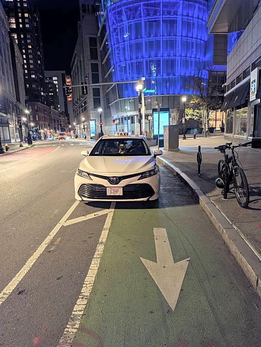 Intersection Of Ralphs Way And Brookline Ave, Boston, MaCar blocking bike lane