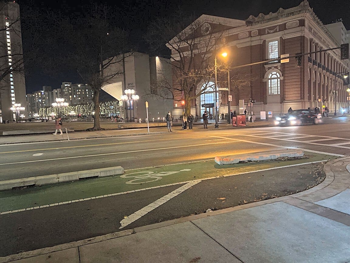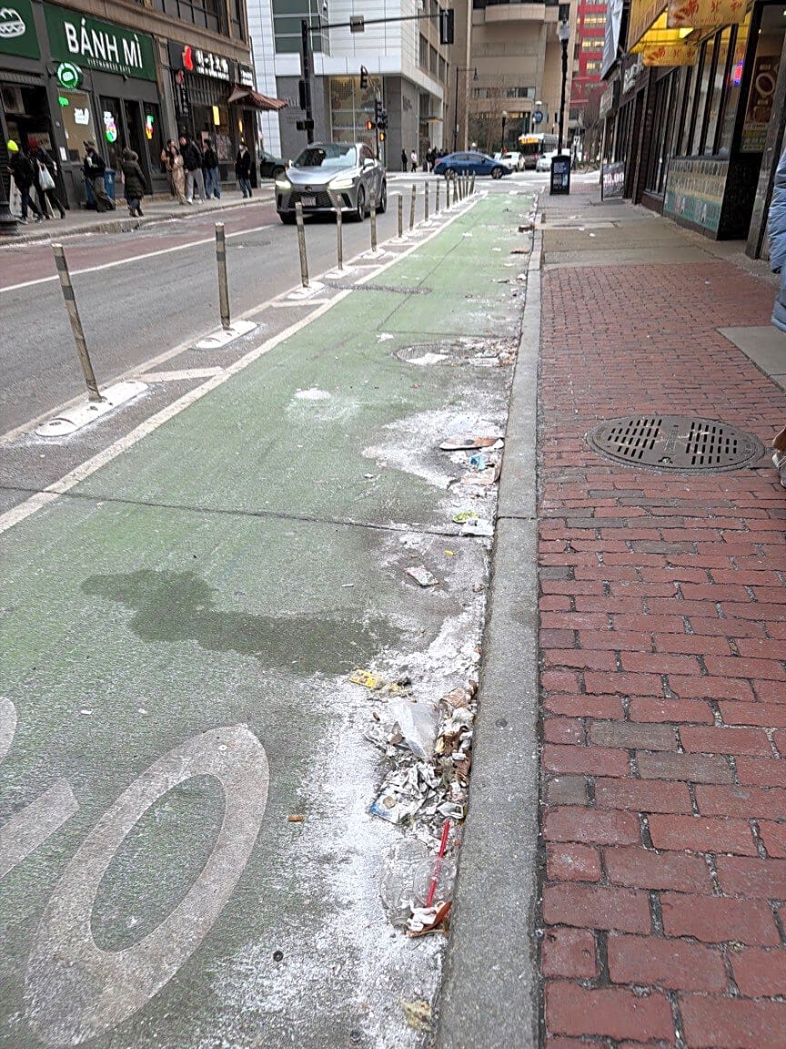 Intersection Of Essex St And Commonwealth Ave, Boston, MaCaller states not enough salt in bike lane. Comm Ave westbound. |