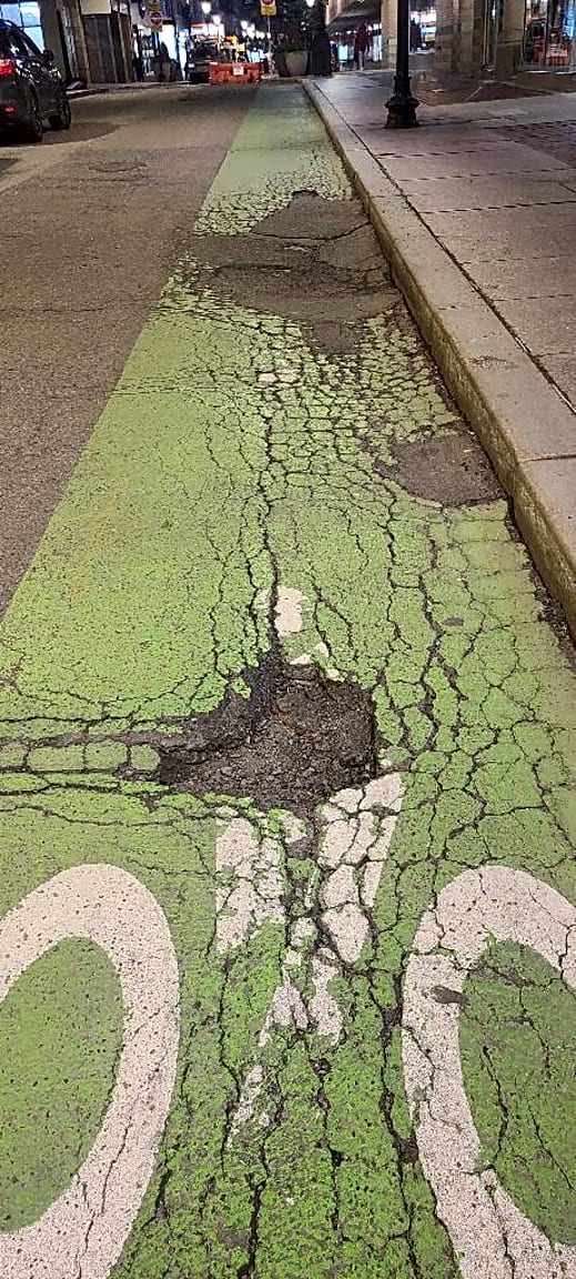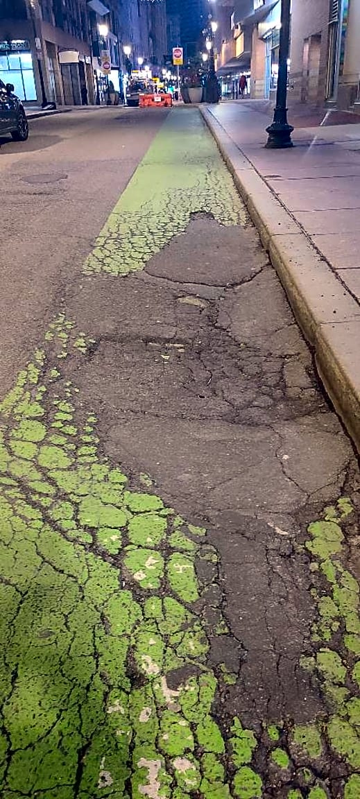 Intersection Of West St And Washington St, Boston, MaThe pavement in the bike lane on Washington St between the Chinatown MBTA station and the Downtown Crossing MBTA station is completely destroyed and has craters in it, making it extremely dangerous for cyclists.