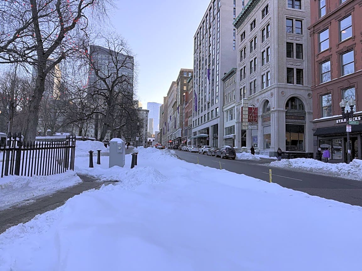 Intersection Of Carver St And Boylston St And Charles St, Boston, MaBoylston St bike lane is full of snow