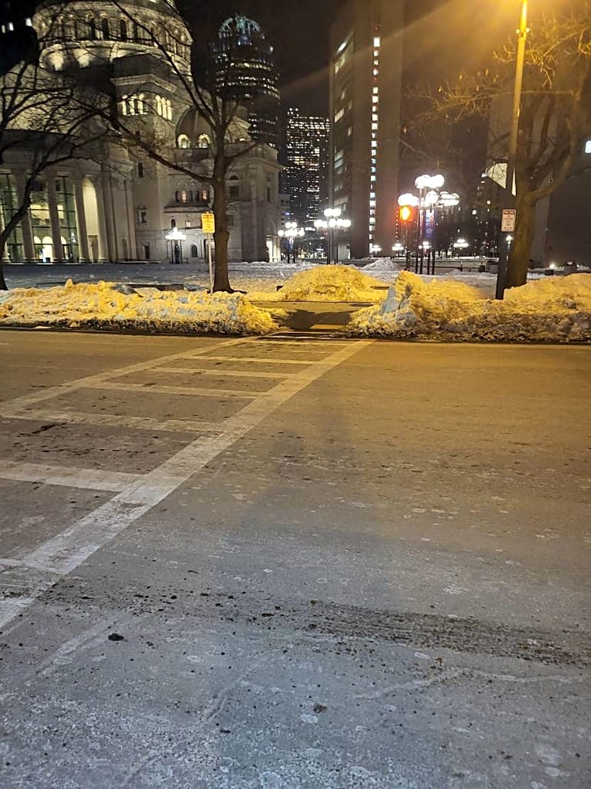 Intersection Of Milford St And Tremont St, Boston, MaCrosswalk obstructed by bike lane plowing for multiple days. Crosswalk must remain clear.