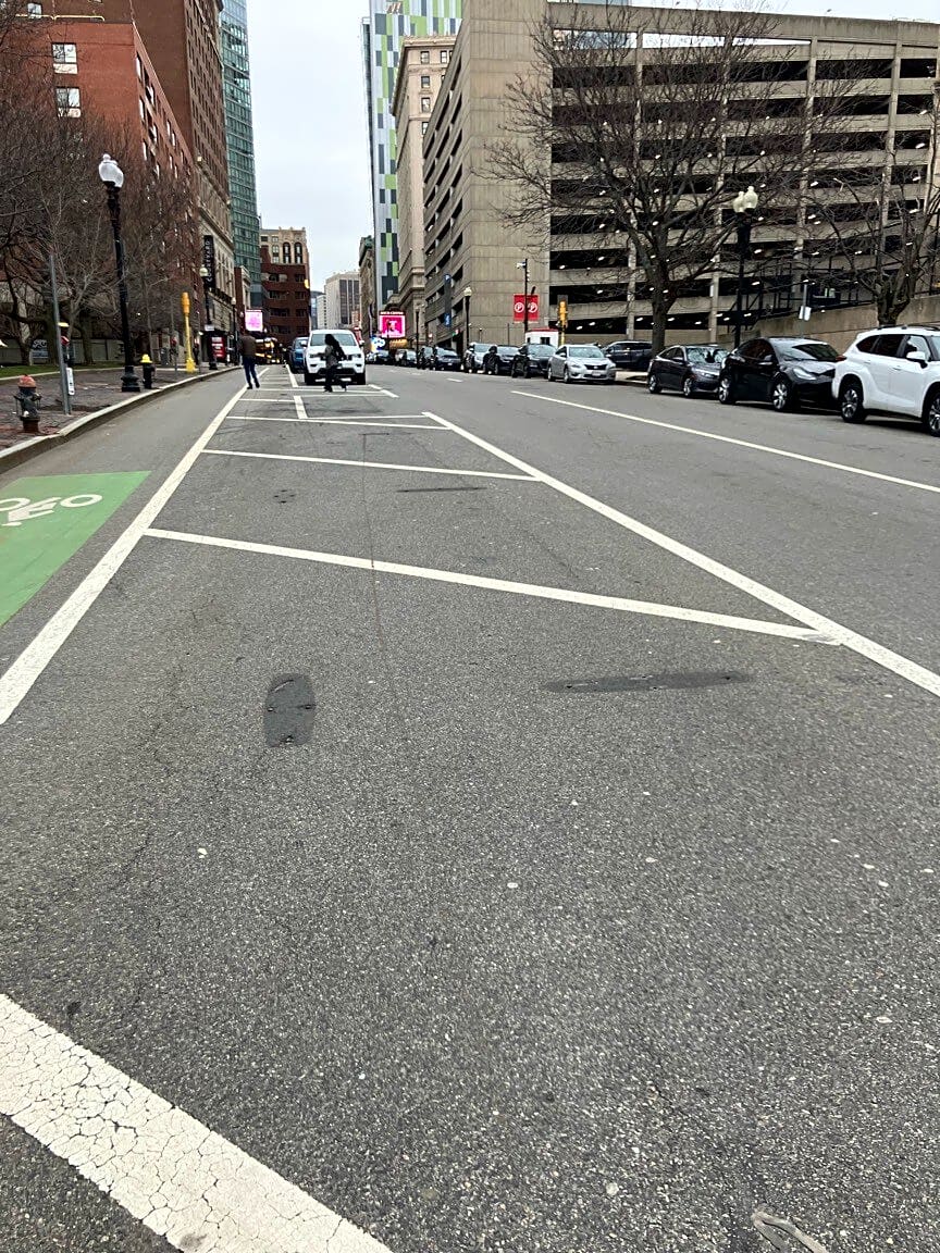Intersection Of Harvard Pl And Washington St, Boston, MaAll flexposts are gone with no separation, and you haven't done anything about the literal craters in the bike lane. So now people on scooters and bikes have to merge into traffic, silver line buses (because you also do nothing to stop drivers from parking in the bus lane), and risk being hit as they try to avoid drivers parked in the bike lane or the craters you neglect to fill.
