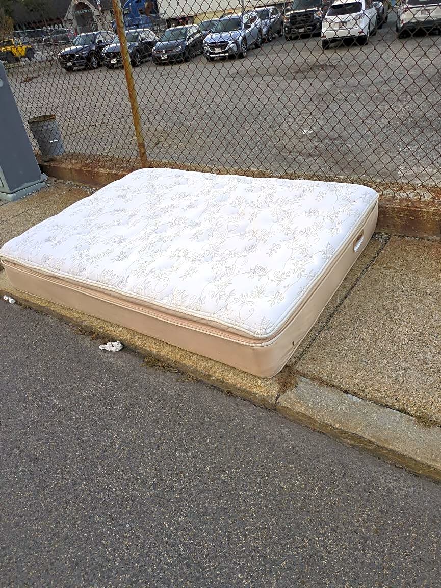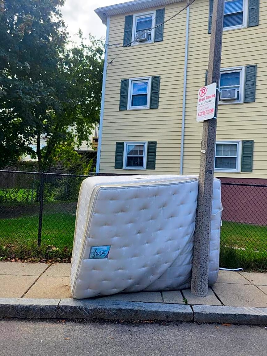 Constituent reporting that a queen mattress was illegally dumped on the side of the property on Border St. and requesting that this be picked up and removed. | Type of debris: [Debris Pickup] Cars parked on the street: [Yes]
