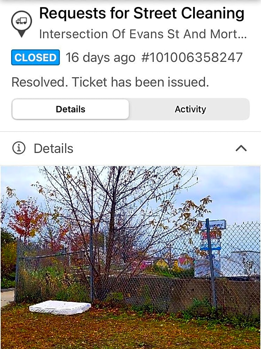 39 Dwight St, Roxbury, Ma, 02118Case #101006372397..not closed ..still on roadway! Pls pickup in alley #705 South End