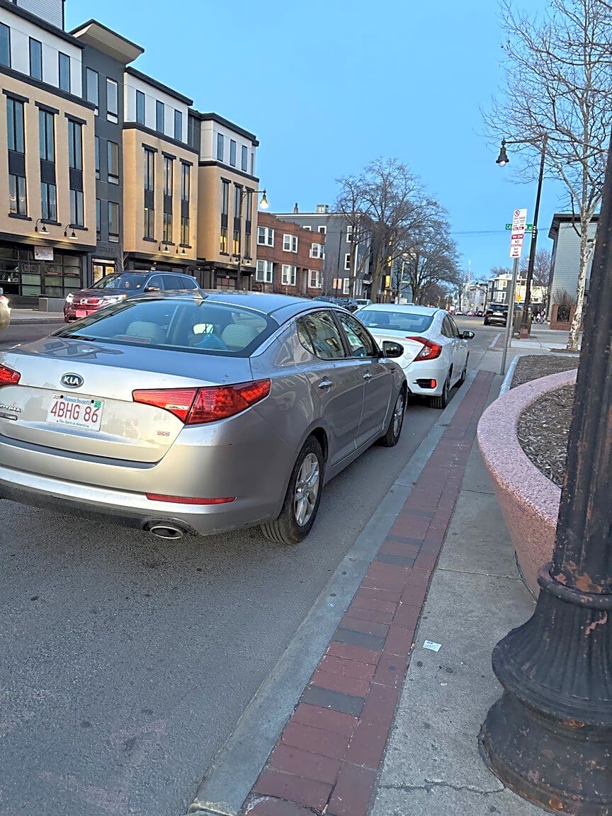 Intersection Of Faunce Rd And Fremont St, Mattapan, MaCars are parked on the sidewalk. They are making it difficult to safely turn off the street. A emergency vehicle could barely get by.