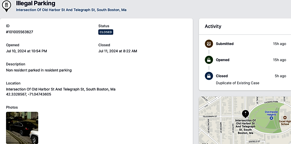1 City Hall Plz, Boston, Ma, 02108Illegal parking is being indiscriminately marked as "duplicate" (and other ... untruths). Can the City have neighborhood restrictions enforced. The lack of enforcement and is obvious and frustrating on its own. BTD's favoring certain non-residents and allowing out-of-staters to park for as long as they want (among other things they do) is beyond inappropriate.