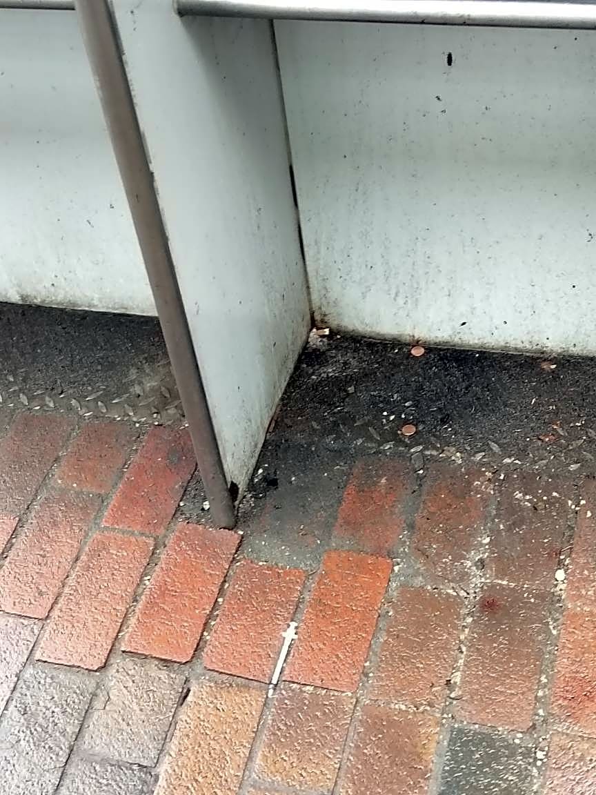 725 Massachusetts Ave, Roxbury, Ma, 02118721 Massachusetts Avenue. Needle on the ground in front of payphones.