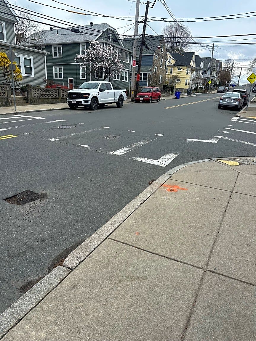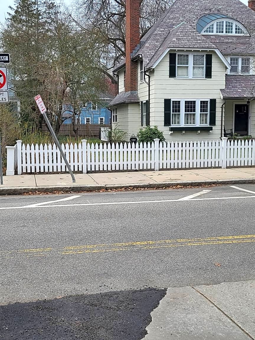 51 57 Eliot St, Jamaica Plain, Ma, 02130Please move bent sign to beginning of painted area. Cars park up to sign making truck turns difficult to impossible. Signage on ground is the accurate ate needed. Thank you.