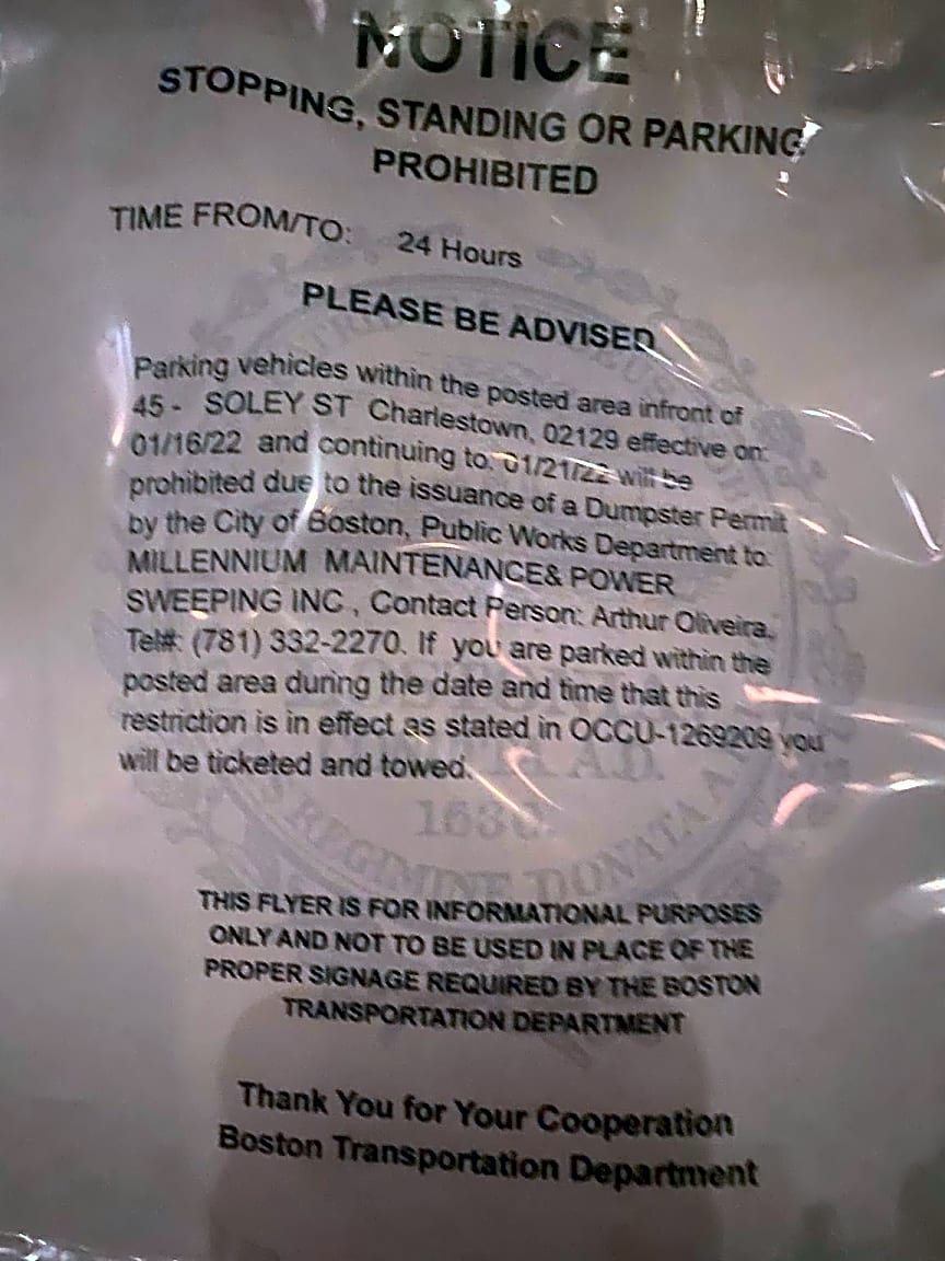 45 Soley St, Charlestown, Ma, 02129The contractor working on 45 soley st has been putting random cones and placing his permits for an entire block for one dumpster. Tonight the workers were putting up more cones to stop anyone from parking in the two spaces left even though their permit expired on the 21st. Please make sure they only claim enough space for the dumpster. Parking is tight in Charlestown. Many thanks.