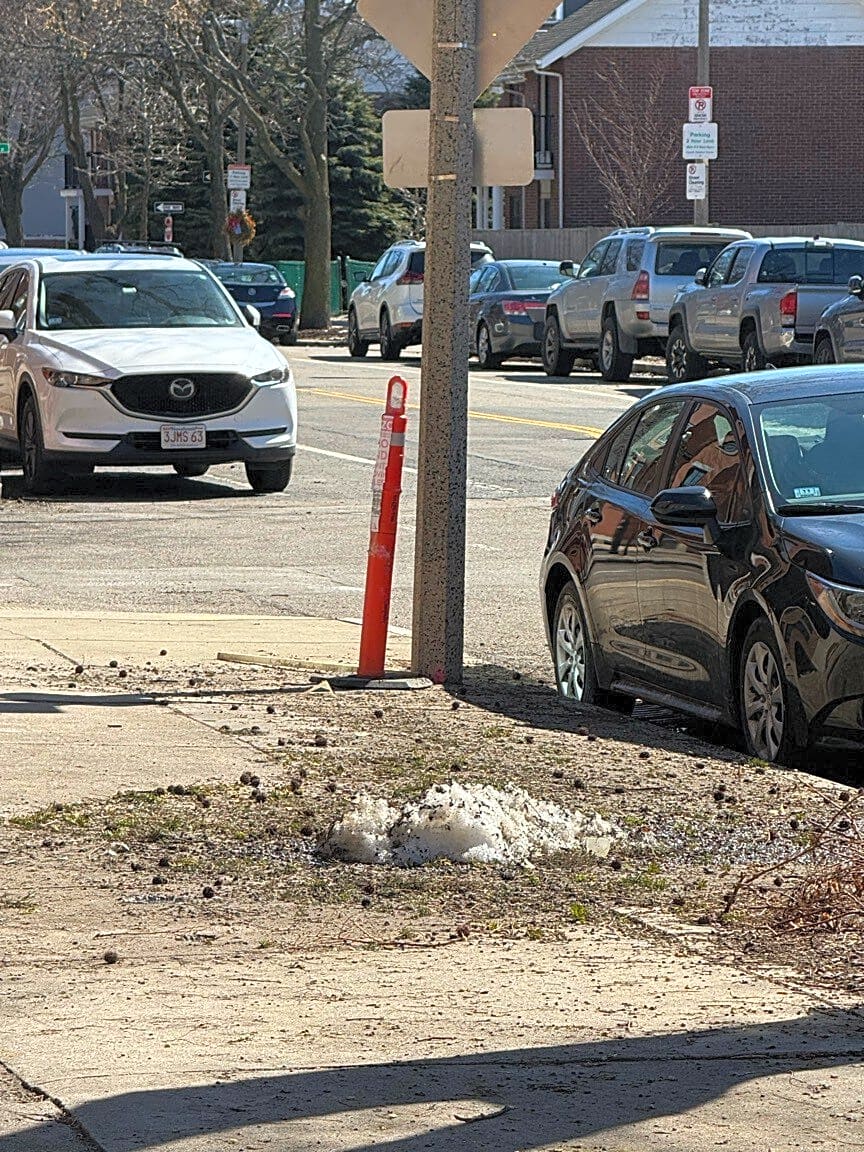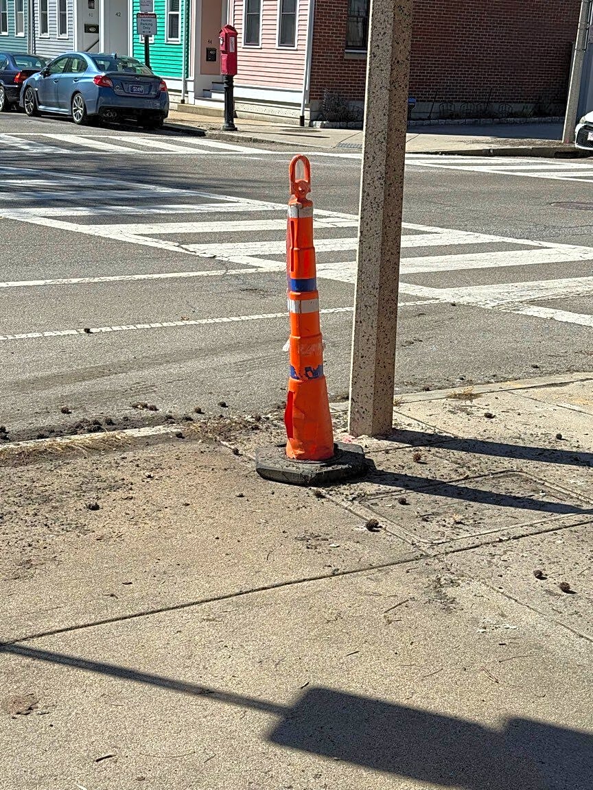 Intersection Of Baldwin St And Main St, Charlestown, MaPublic Works cones on walkway since November. Can we have them picked up? Was hoping someone would take for space savers last week. Oh well. Good neighbors on Main Street don’t need no stinking spaces savers.