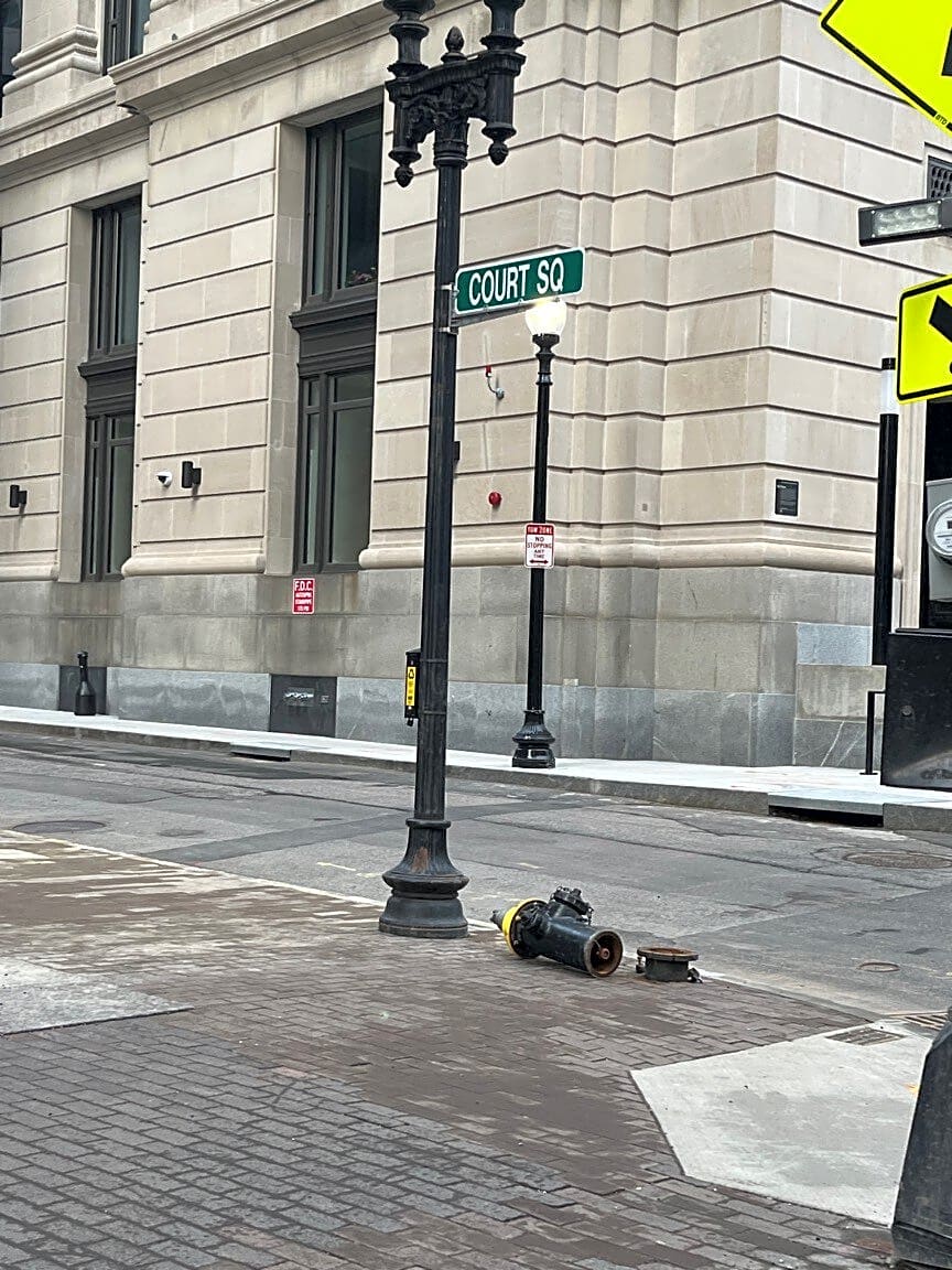 Intersection Of Court Sq And Court St, Boston, MaFire hydrant knocked down.