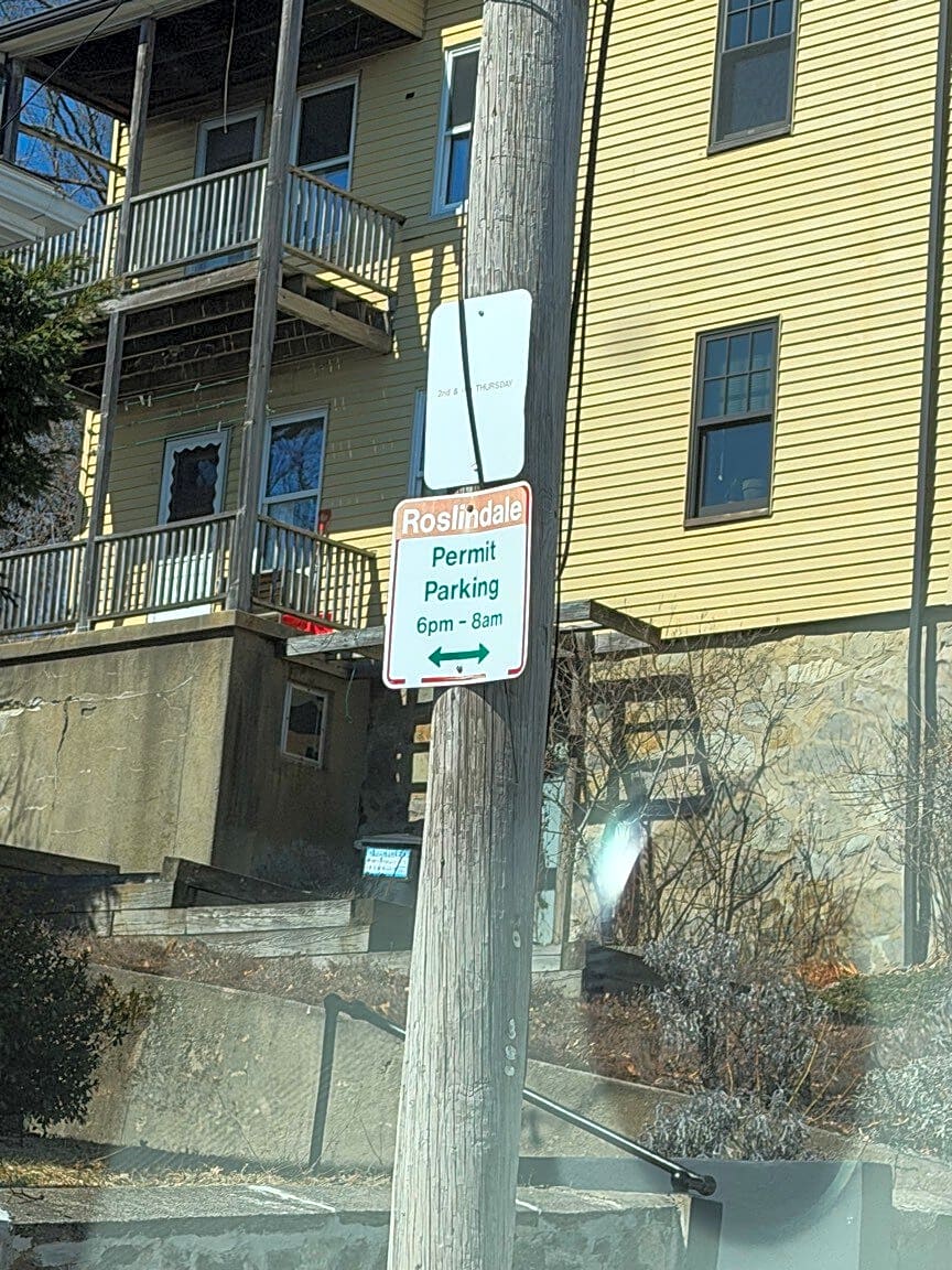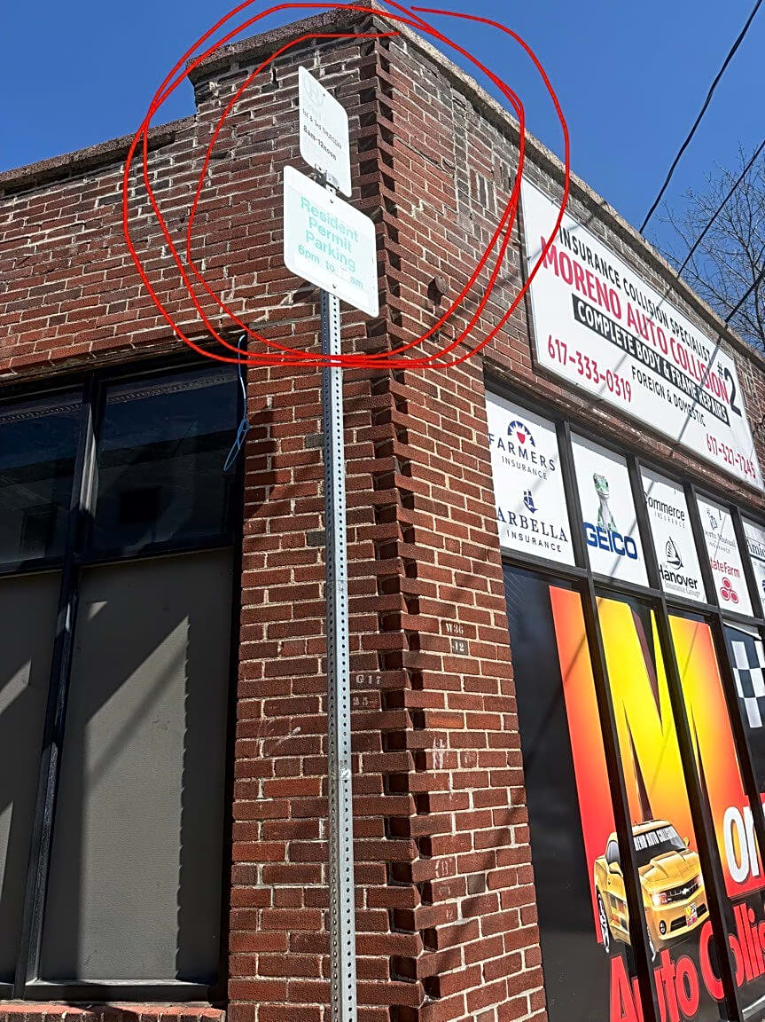 675 675 A South St, Roslindale, Ma, 02131Faded parking signs on both sides of Lee Hill Rd. One is by Moreno’s, one is across the street and up a tiny bit by a driveway.